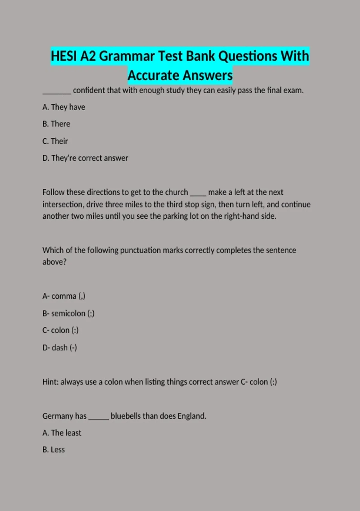 _______ confident that with enough study they can easily pass the final exam. A. They have B. There C. Their D. They're correct answer Follow these directions to get to the church ____ make a left at the next intersection, drive three miles to the third stop sign, then turn left, and continue another two miles until you see the parking lot on the right-hand side. Which of the following punctuation marks correctly completes the sentence above? A- comma (,) B- semicolon (;) C- colon (:) D- dash (-) Hint: always use a colon when listing things correct answer C- colon (:) Germany has _____ bluebells than does England. A. The least B. Less