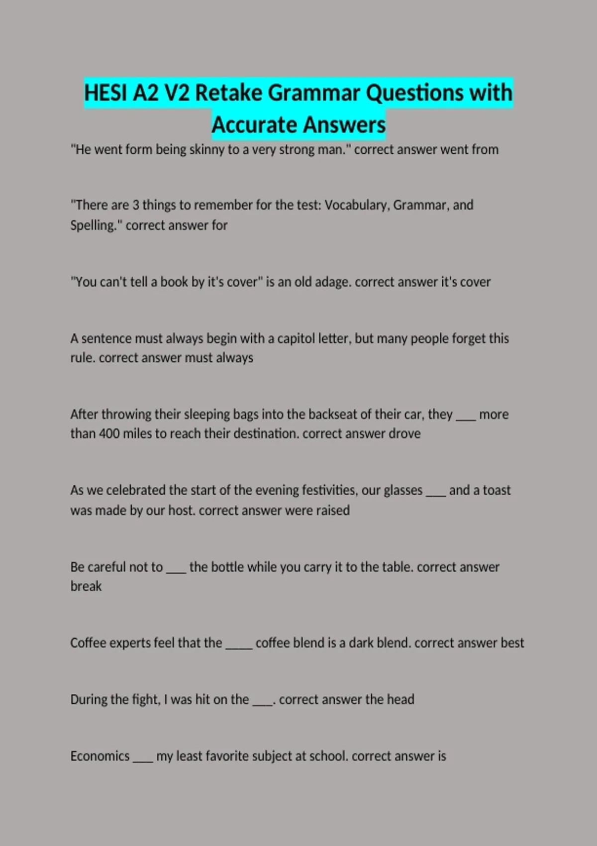 HESI A2 V2 Retake Grammar Questions with Accurate Answers