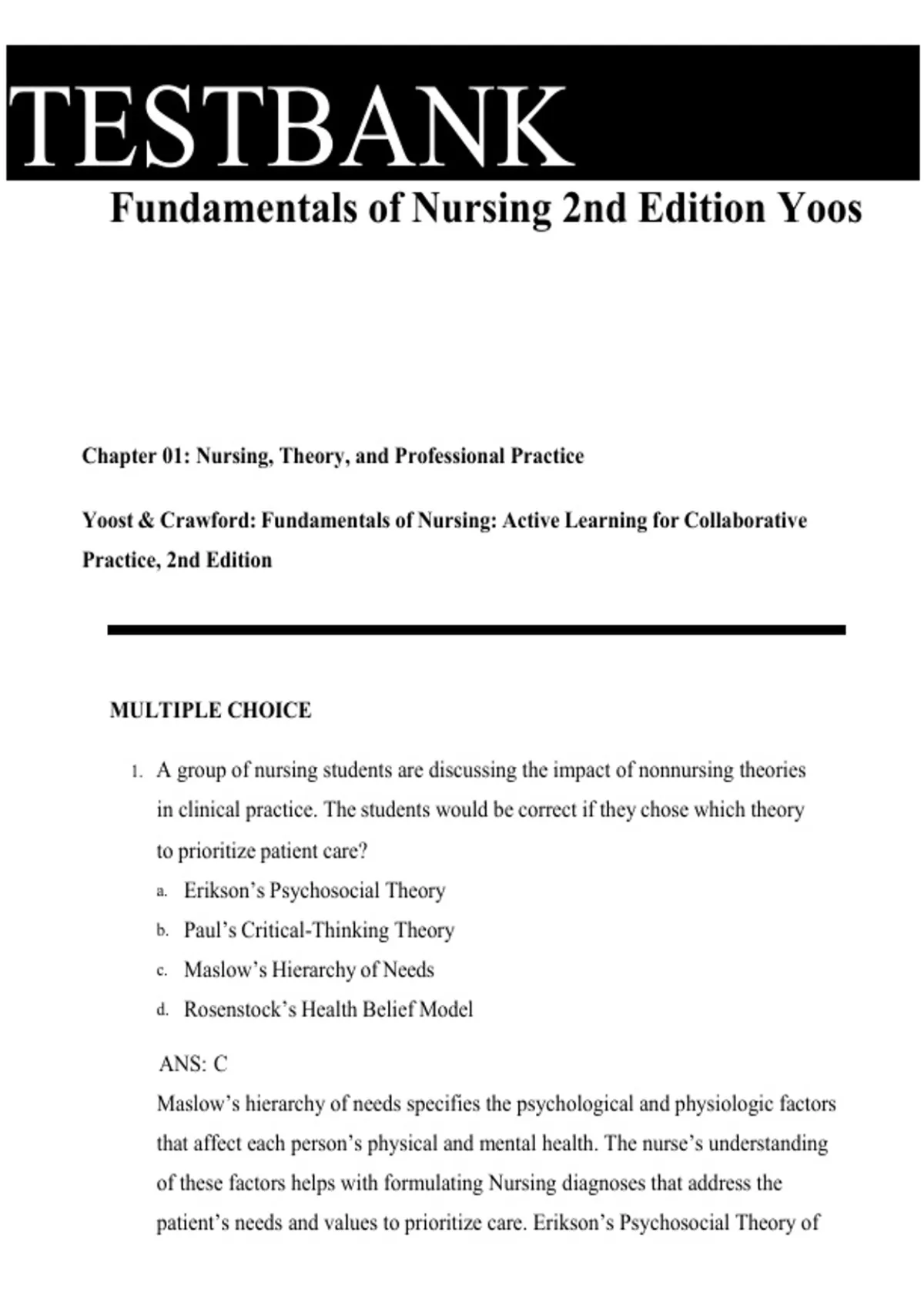 Comprehensive test bank for Fundamentals of Nursing 2nd Edition by Yoost. Includes verified questions and answers covering all core nursing concepts, clinical skills, and patient care topics, perfect for focused exam preparation and study success.