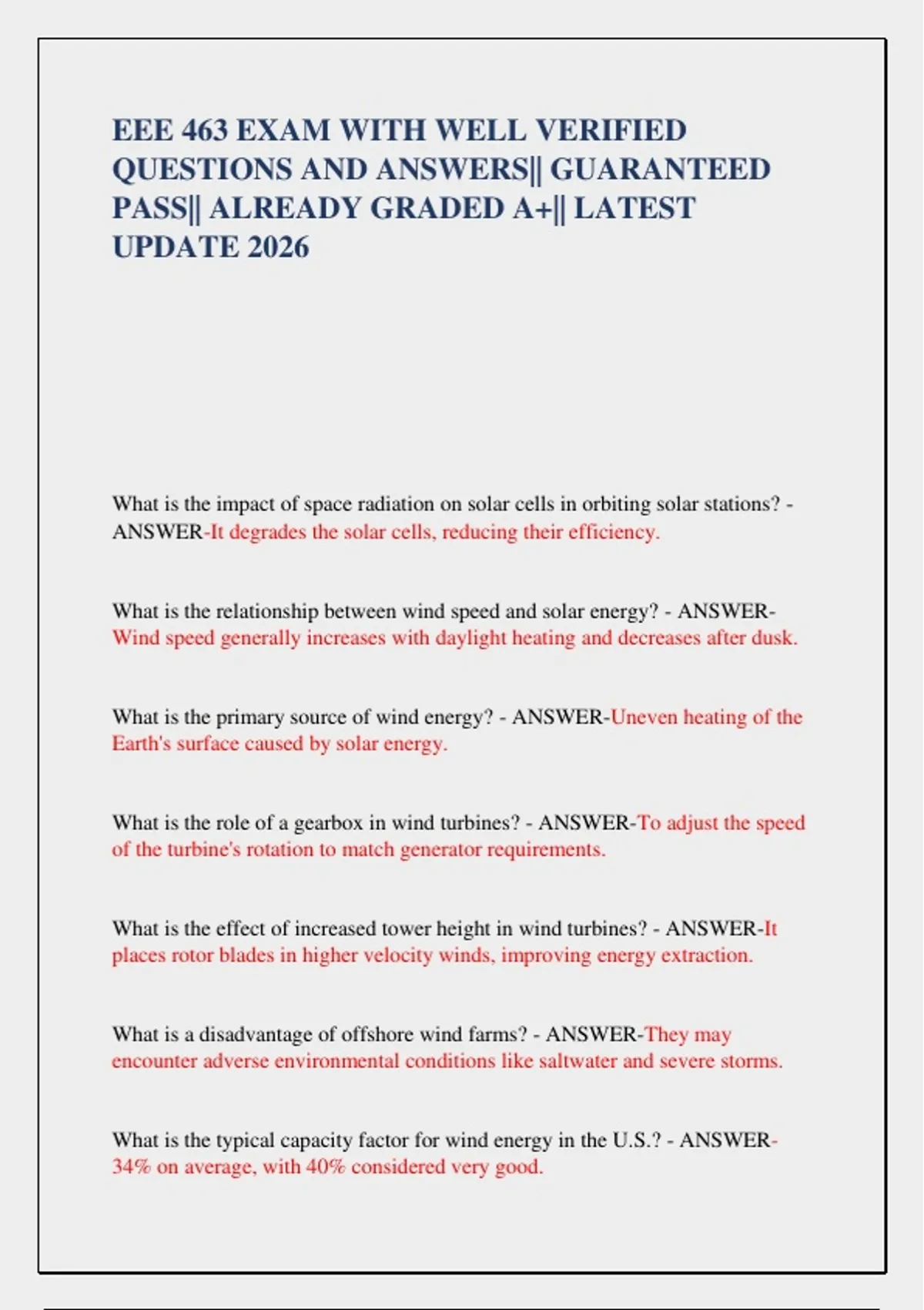 EEE 463 EXAM WITH WELL VERIFIED QUESTIONS AND ANSWERS|| GUARANTEED PASS|| ALREADY GRADED A+|| LATEST UPDATE 2026 What is the impact of space radiation on solar cells in orbiting solar stations? - ANSWER-It degrades the solar cells, reducing their efficiency. What is the relationship between wind speed and solar energy? - ANSWER Wind speed generally increases with daylight heating and decreases after dusk. What is the primary source of wind energy? - ANSWER-Uneven heating of the Earth's surface caused by solar energy. What is the role of a gearbox in wind turbines? - ANSWER-To adjust the speed of the turbine's rotation to match generator requirements. What is the effect of increased tower height in wind turbines? - ANSWER-It places rotor blades in higher velocity winds, improving energy extraction. What is a disadvantage of offshore wind farms? - ANSWER-They may encounter adverse environmental conditions like saltwater and severe storms. What is the typical capacity factor for wind energy in the U.S.? - ANSWER 34% on average, with 40% considered very good. What is the primary challenge of maintaining hydropower systems? - ANSWER-High capital costs and potential environmental impacts. What is the significance of the Sihwa Lake Tidal Power Station? - ANSWER-It has a capacity of 254 MWe, eclipsing La Rance What is the mean operating tidal range of the Sihwa Lake Tidal Power Station? - ANSWER-18 feet What is the formula for calculating power in ocean current power systems? - ANSWER-Ptot = ρ A v³ / 2 gc What is a tidal stream turbine? - ANSWER-A turbine similar to a wind turbine, but underwater What are some challenges of ocean current installations? - ANSWER-Clearance for shipping, fishing accessibility, fish injury, maintenance issues What is the purpose of energy storage in renewable energy systems? - ANSWER-To manage the unavailability of intermittent energy sources What are dispatchable energy sources? - ANSWER-Fossil, nuclear, biomass, and geothermal What is demand side management (DSM)? - ANSWER-Adjusting electric rates and utility control to manage energy demand What is the role of energy storage in economics? - ANSWER-To reduce peak loads and capital expenditures for peak plants What is the density of seawater compared to air? - ANSWER-850 times greater What is a significant issue with tidal energy output? - ANSWER-Hydraulic turbines cannot be 100% efficient