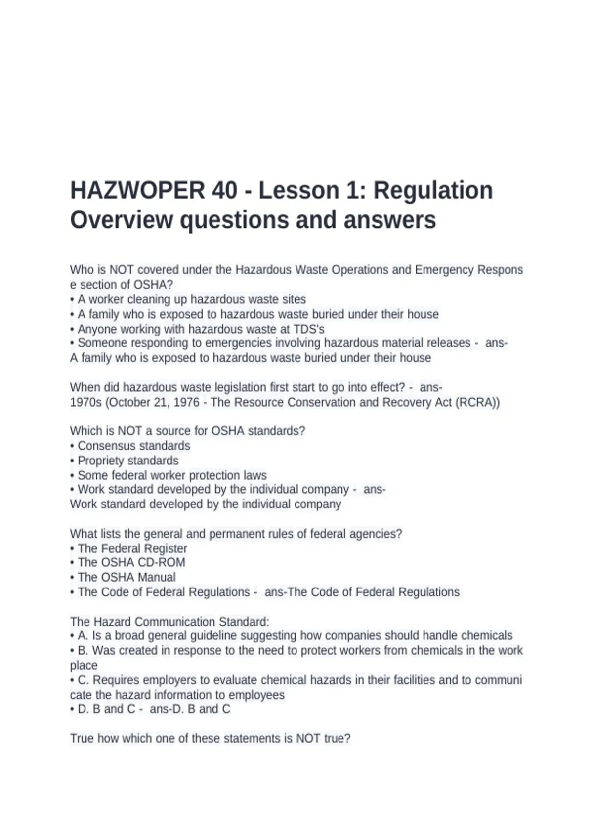 HAZWOPER 40 - Lesson 1: Regulation Overview questions and answers