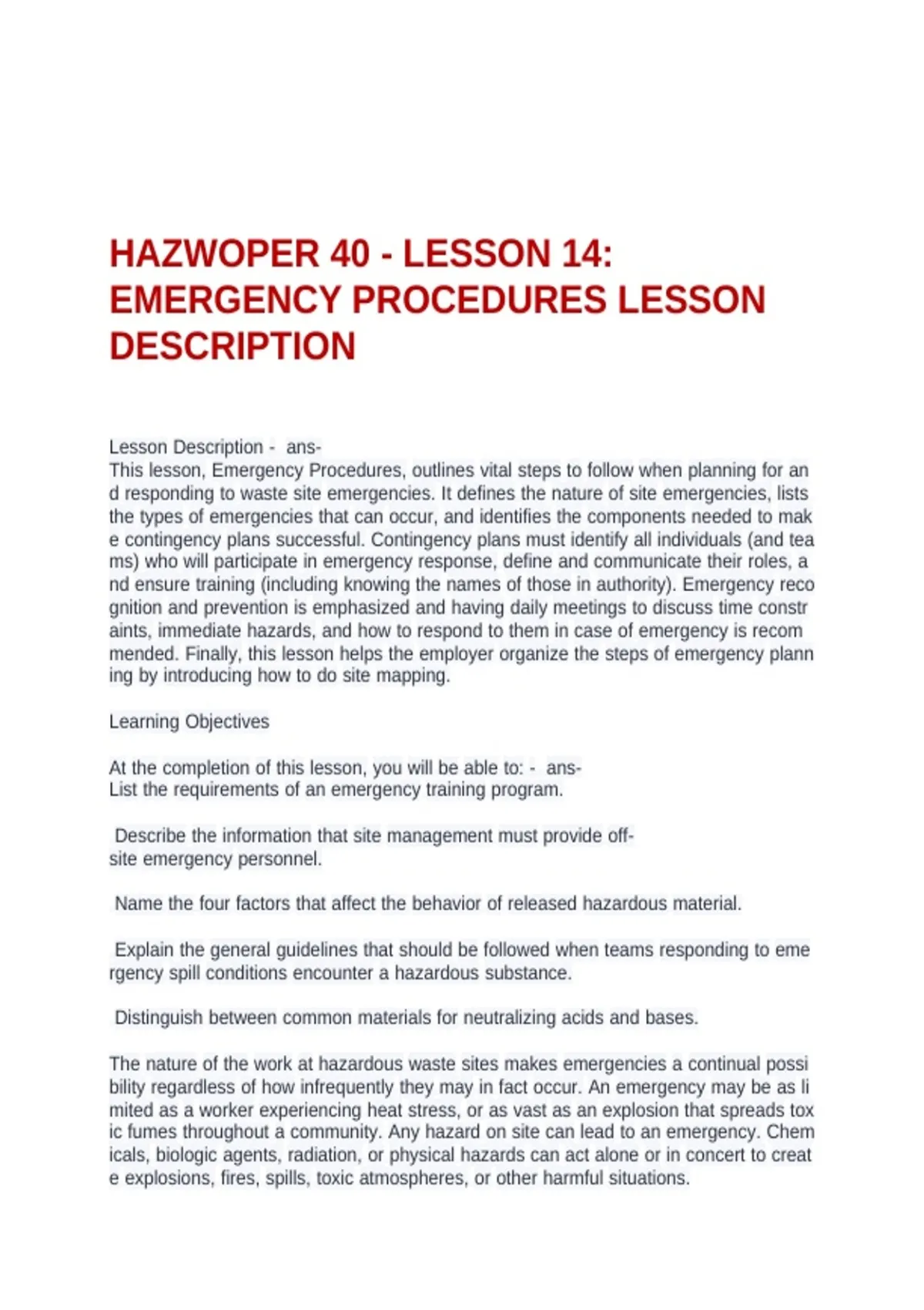 HAZWOPER 40 - LESSON 14: EMERGENCY PROCEDURES LESSON DESCRIPTION