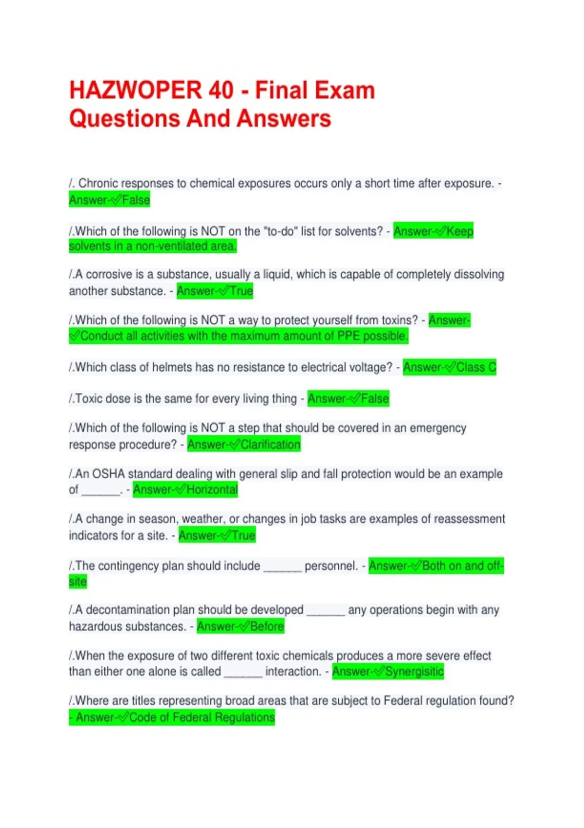 HAZWOPER 40 - Final Exam Questions And Answers /. Chronic responses to chemical exposures occurs only a short time after exposure. - Answer-False /.Which of the following is NOT on the "to-do" list for solvents? - Answer-Keep solvents in a non-ventilated area. /.A corrosive is a substance, usually a liquid, which is capable of completely dissolving another substance. - Answer-True /.Which of the following is NOT a way to protect yourself from toxins? - Answer-Conduct all activities with the maximum amount of PPE possible. /.Which class of helmets has no resistance to electrical voltage? - Answer-Class C /.Toxic dose is the same for every living thing - Answer-False /.Which of the following is NOT a step that should be covered in an emergency response procedure? - Answer-Clarification /.An OSHA standard dealing with general slip and fall protection would be an example of ______. - Answer-Horizontal /.A change in season, weather, or changes in job tasks are examples of reassessment indicators for a site. - Answer-True /.The contingency plan should include ______ personnel. - Answer-Both on and off-site /.A decontamination plan should be developed ______ any operations begin with any hazardous substances. - Answer-Before /.When the exposure of two different toxic chemicals produces a more severe effect than either one alone is called ______ interaction. - Answer-Synergisitic /.Where are titles representing broad areas that are subject to Federal regulation found? - Answer-Code of Federal Regulations