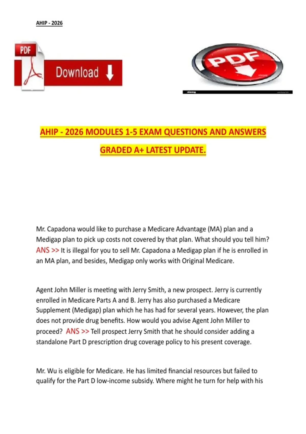 This document includes exam-style practice questions and clear answers covering AHIP 2026 Modules 1–5, including Medicare basics, Parts A and B, Medicare Advantage, Part D, and other key Medicare concepts. The material is structured to reflect the latest AHIP 2026 updates and is intended to support thorough preparation and high exam performance.