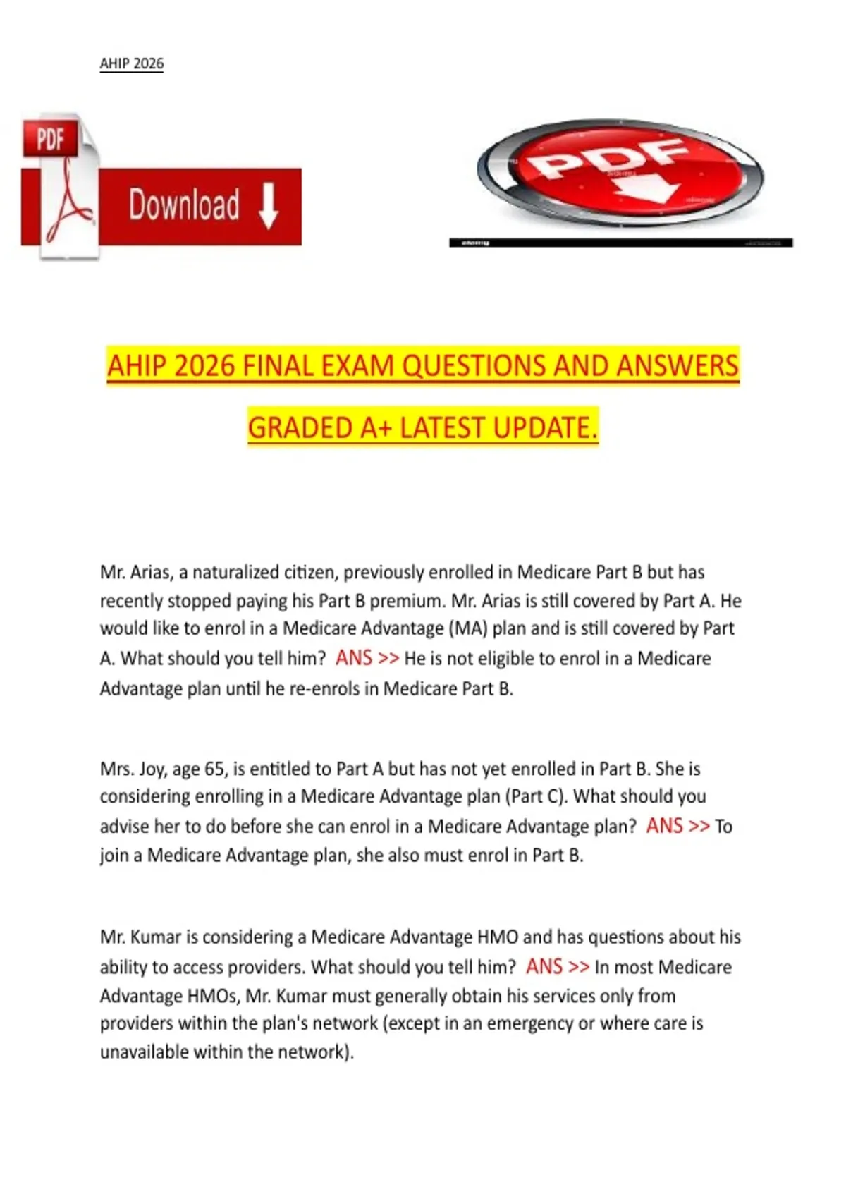 This document contains a comprehensive set of AHIP 2026 final exam questions with graded answers. It covers all major topics tested on the AHIP certification exam, including Medicare, compliance, fraud, waste, abuse, and discrimination. The material is designed to help students review key concepts, apply knowledge to real-world scenarios, and prepare effectively for the AHIP final assessment.