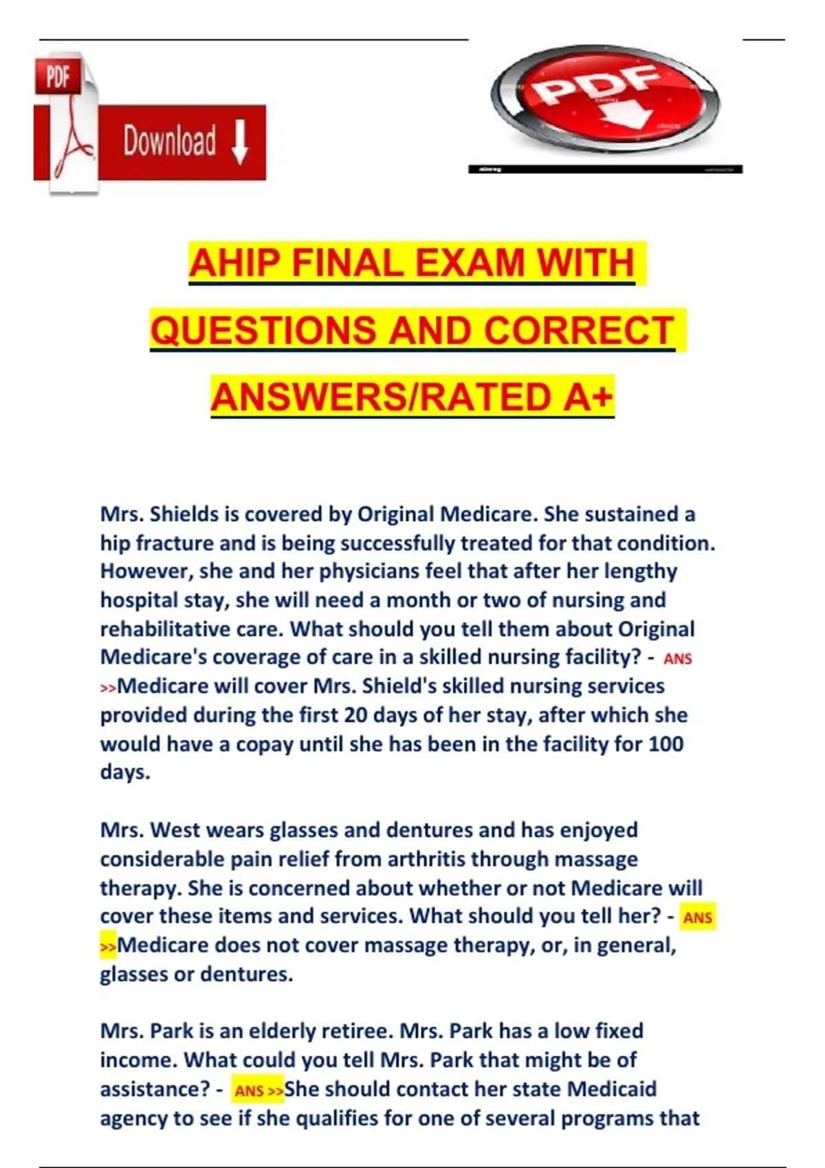 This document provides a full set of AHIP final exam questions with correct answers, rated A+, covering all key topics required for AHIP certification. It includes detailed content on Medicare, compliance, fraud, waste, abuse, and discrimination, helping students understand concepts and prepare for real-world exam scenarios. The material is aligned with current AHIP standards and regulations.