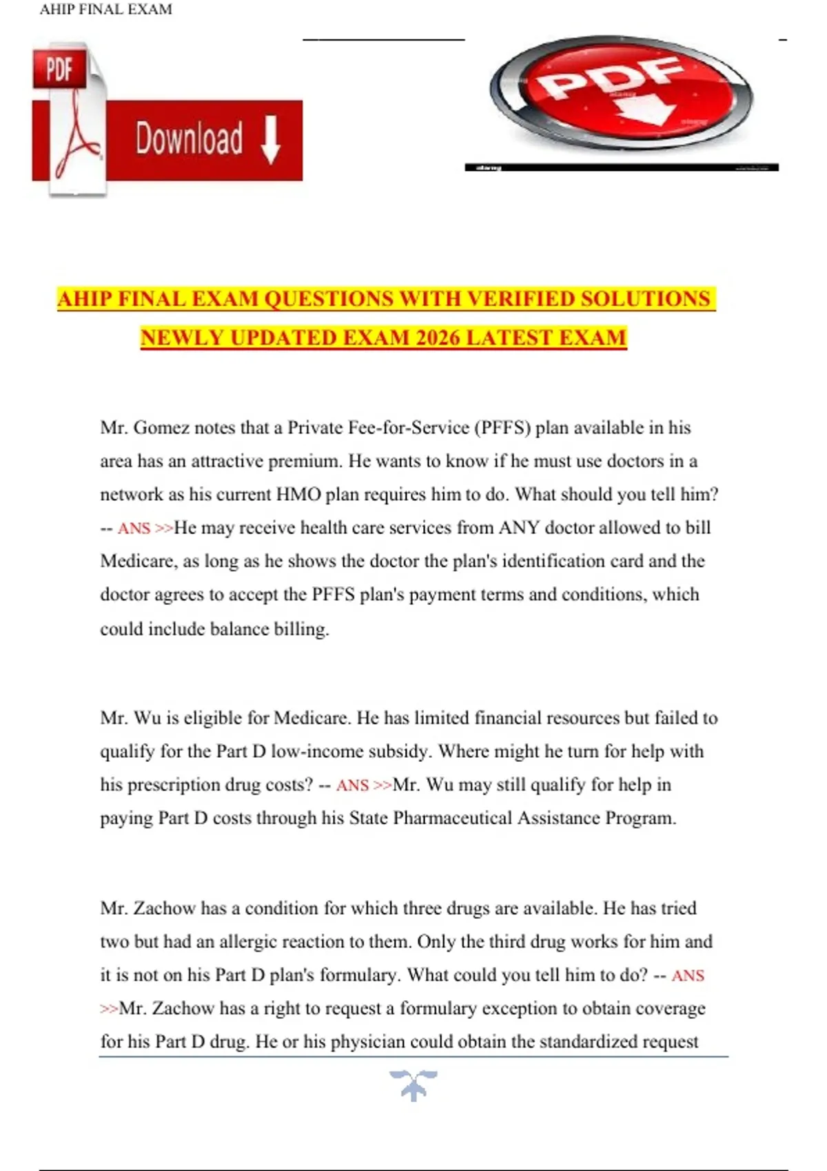 This document provides the AHIP 2026 final exam questions along with verified solutions, reflecting the most recent updates. It covers all major AHIP topics, including Medicare compliance, fraud, waste, abuse, and discrimination, to help students prepare effectively for certification. The material is comprehensive and aligned with current AHIP standards.