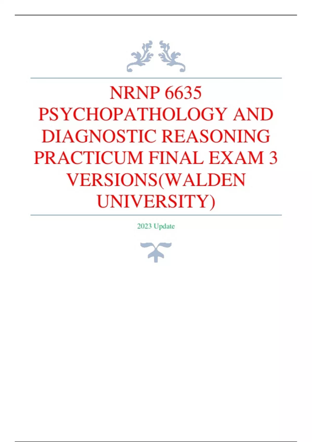 NRNP 6635 PSYCHOPATHOLOGY AND DIAGNOSTIC REASONING PRACTICUM FINAL EXAM 3 VERSIONS(WALDEN UNIVERSITY)