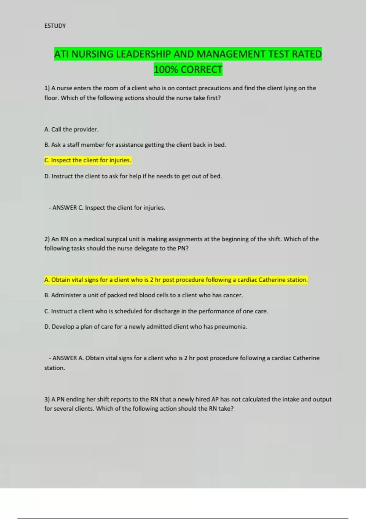 ATI NURSING LEADERSHIP AND MANAGEMENT TEST RATED 100% CORRECT