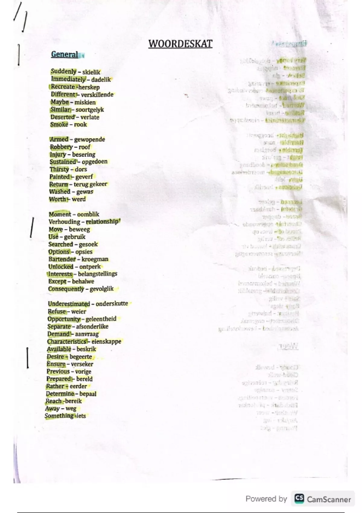 Notes on general Afrikaans woordeskat that is shown to be helpful and appear in Afrikaans papers. Also allows the learner to increase their use of words in their essays and helps them understand. by providing keywords that they pick up on in Afrikaans papers. Helps to expand their vocabulary