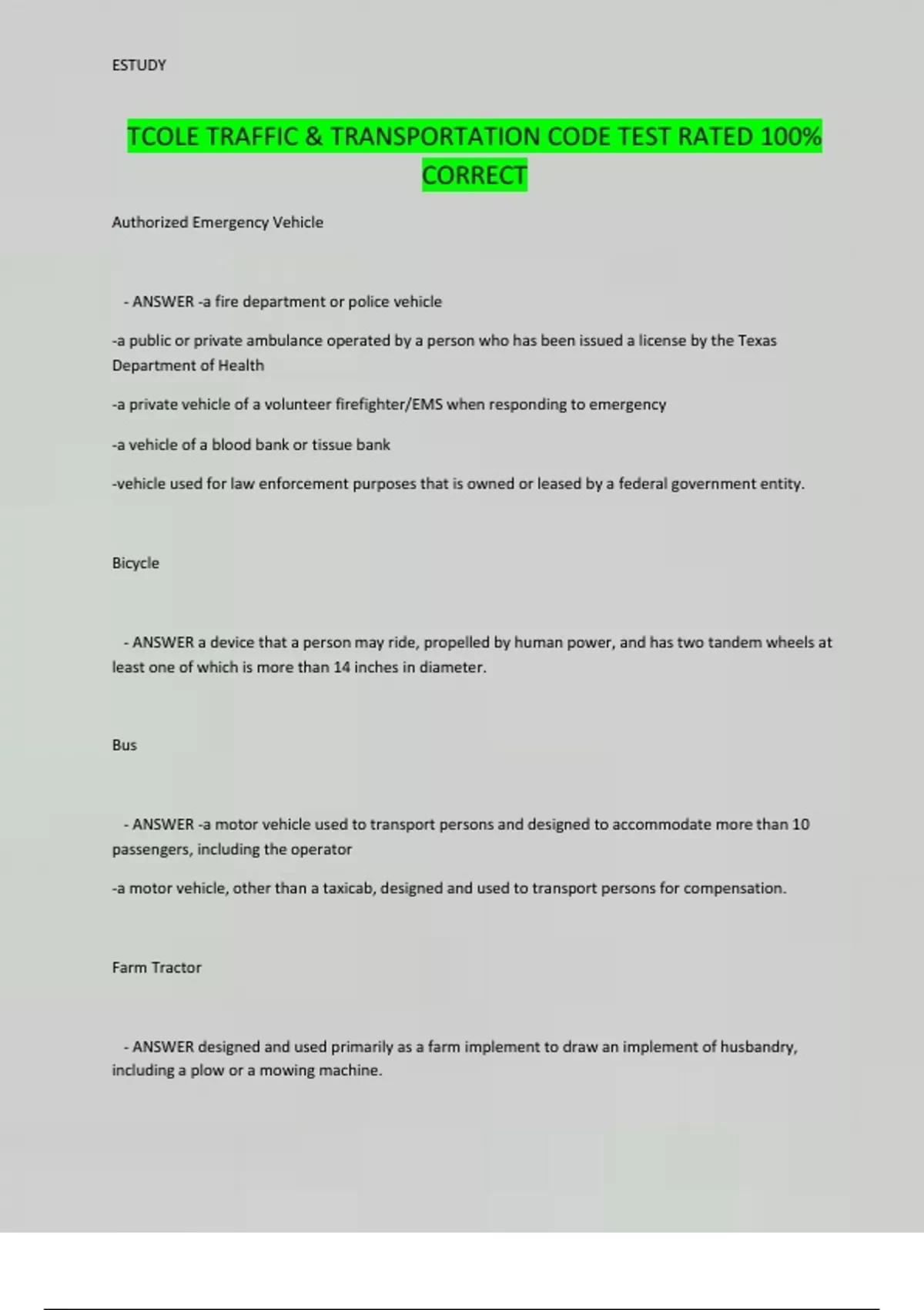 TCOLE TRAFFIC & TRANSPORTATION CODE TEST RATED 100% CORRECT