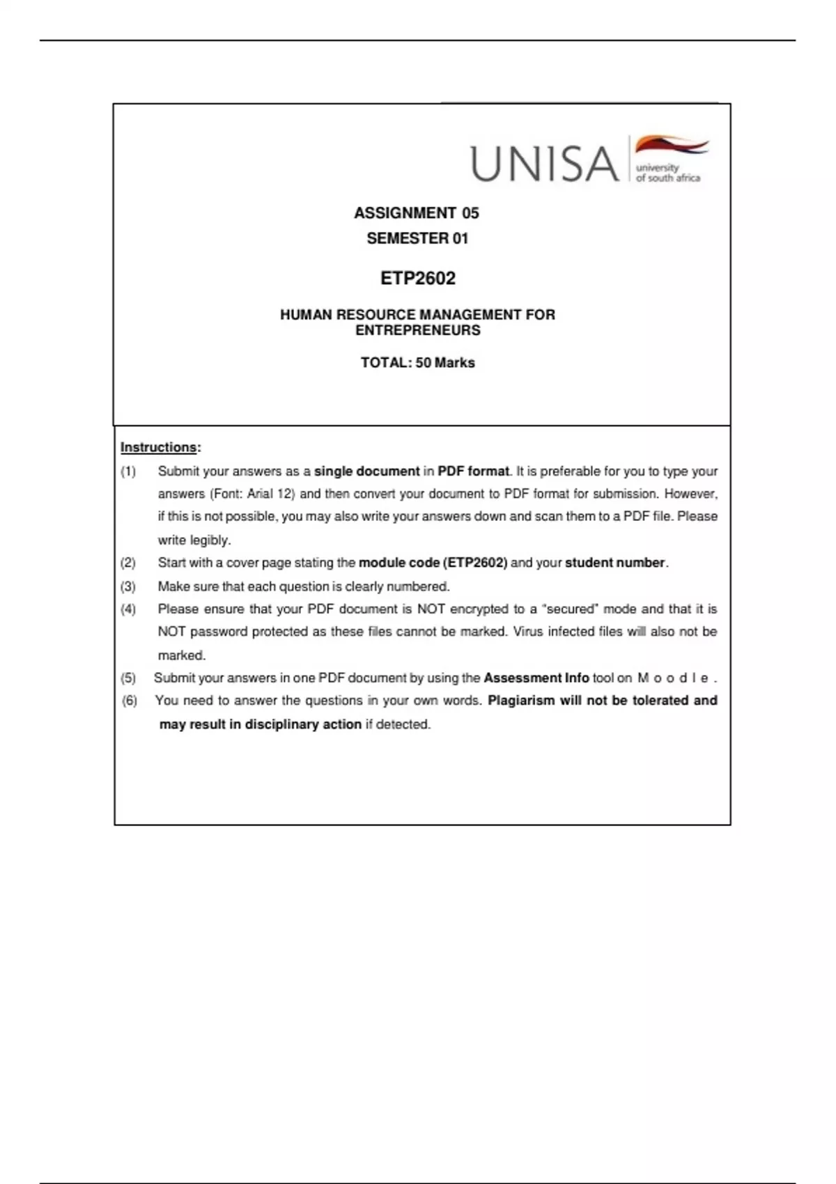 (2) Start with a cover page stating the module code (ETP2602) and your student number.
