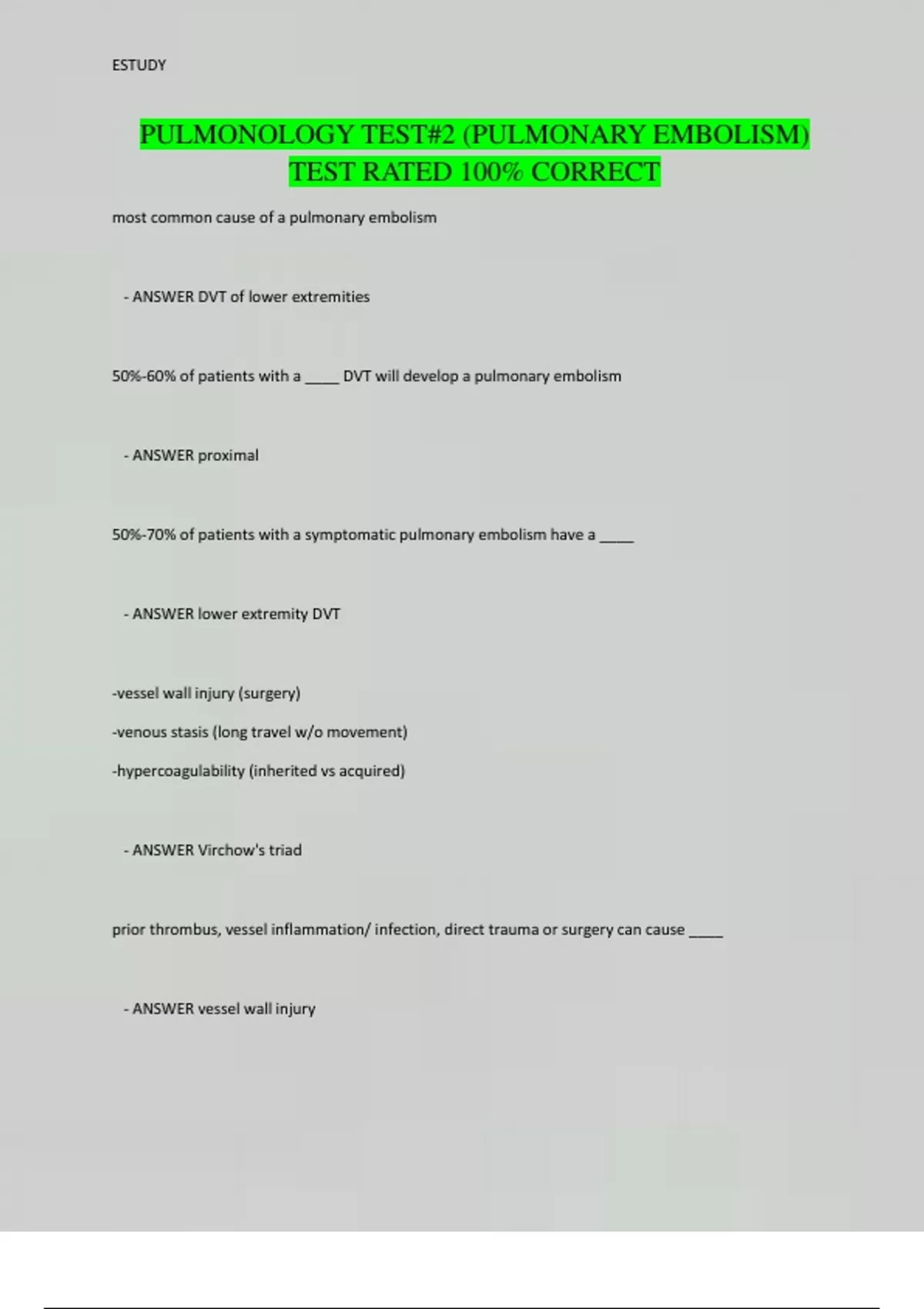 PULMONOLOGY TEST#2 (PULMONARY EMBOLISM) TEST RATED 100% CORRECT