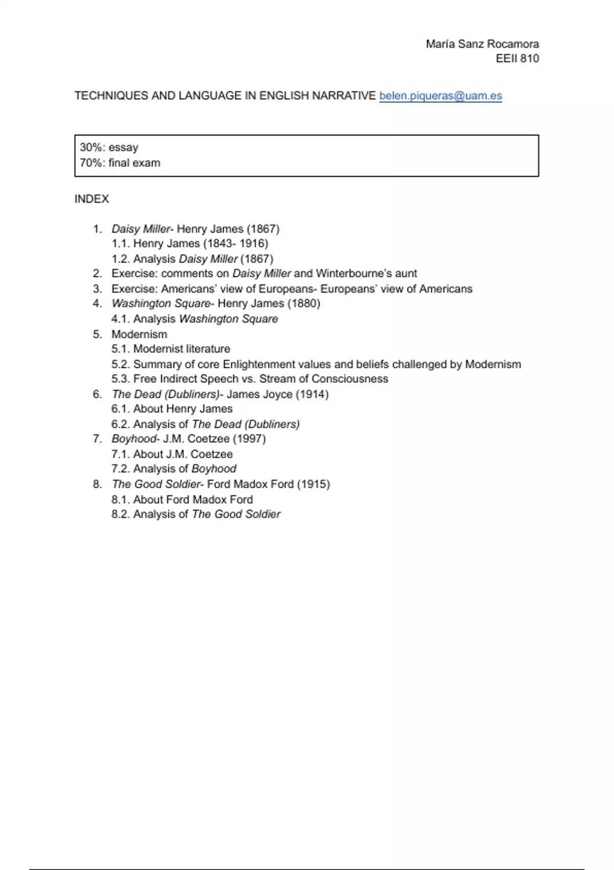Este documento incluye información de los diferentes periodos históricos en la literatura, así como análisis de las obras Daisy Miller, Boyhood, Washington Square, The Dead (Dubliners), The Good Soldier
