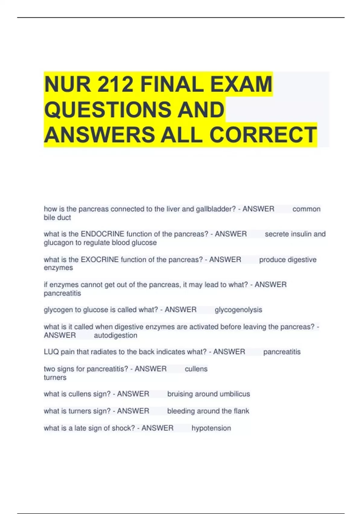 NUR 212 FINAL EXAM QUESTIONS AND ANSWERS ALL CORRECT how is the pancreas connected to the liver and gallbladder? - ANSWER common bile duct what is the ENDOCRINE function of the pancreas? - ANSWER secrete insulin and glucagon to regulate blood glucose what is the EXOCRINE function of the pancreas? - ANSWER produce digestive enzymes if enzymes cannot get out of the pancreas, it may lead to what? - ANSWER pancreatitis glycogen to glucose is called what? - ANSWER glycogenolysis what is it called when digestive enzymes are activated before leaving the pancreas? - ANSWER autodigestion LUQ pain that radiates to the back indicates what? - ANSWER pancreatitis two signs for pancreatitis? - ANSWER cullens turners what is cullens sign? - ANSWER bruising around umbilicus what is turners sign? - ANSWER bleeding around the flank what is a late sign of shock? - ANSWER hypotension what abg will pancreatitis patients present with? - ANSWER metabolic acidosis what is the goal with treatment for pancreatitis? - ANSWER give the gi (digestive tract) a break what are the 6 P's of peripheral circulation? - ANSWER pain pulselessness poikilothermy (temp) pallor paresthesia paralysis