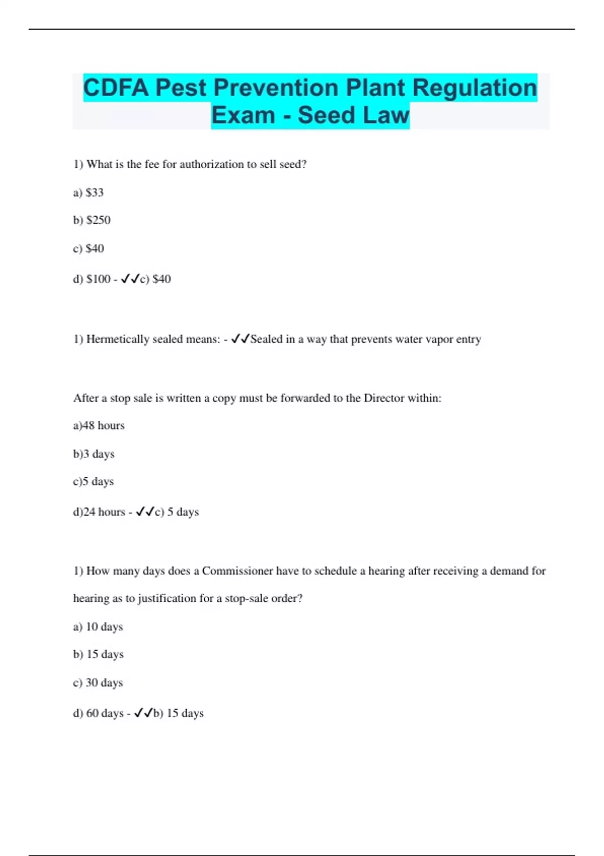1) What is the fee for authorization to sell seed? a) $33 b) $250 c) $40 d) $100 - c) $40 1) Hermetically sealed means: - Sealed in a way that prevents water vapor entry After a stop sale is written a copy must be forwarded to the Director within: a)48 hours b)3 days c)5 days d)24 hours - c) 5 days 1) How many days does a Commissioner have to schedule a hearing after receiving a demand for hearing as to justification for a stop-sale order? a) 10 days b) 15 days c) 30 days d) 60 days - b) 15 daysWhat is "stratification?" - The layering of seeds/plant parts in cold soil/moss to promote germination How do counties profit from the subvention program? - They receive money ($120,000) from state ag department for costs incurred in enforcement of CA seed laws
