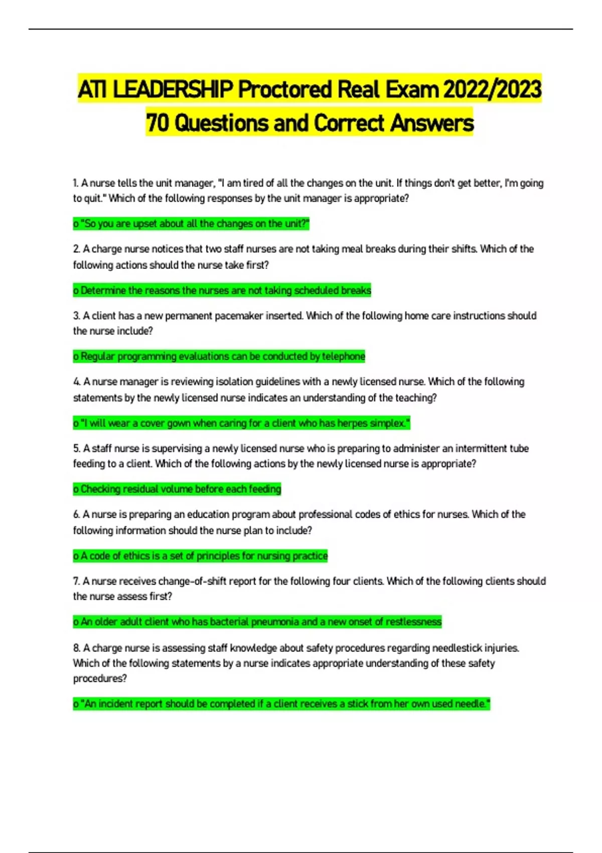 ATI LEADERSHIP Proctored Real Exam 2022/2023 70 Questions and Correct Answers