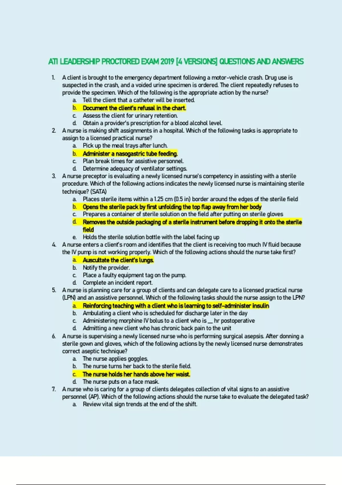 ATI LEADERSHIP PROCTORED EXAM 2019 [4 VERSIONS] QUESTIONS AND ANSWERS