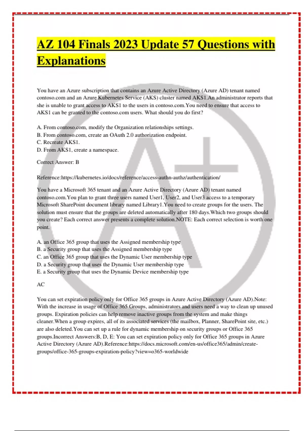 AZ 104 Microsoft Azure Finals 2023 Update 57 Questions with Explanations You have an Azure subscription that contains an Azure Active Directory (Azure AD) tenant named and an Azure Kubernetes Service (AKS) cluster named AKS1.An administrator reports that she is unable to grant access to AKS1 to the users in .You need to ensure that access to AKS1 can be granted to the users. What should you do first? A. From , modify the Organization relationships settings. B. From , create an OAuth 2.0 authorization endpoint. C. Recreate AKS1. D. From AKS1, create a namespace.