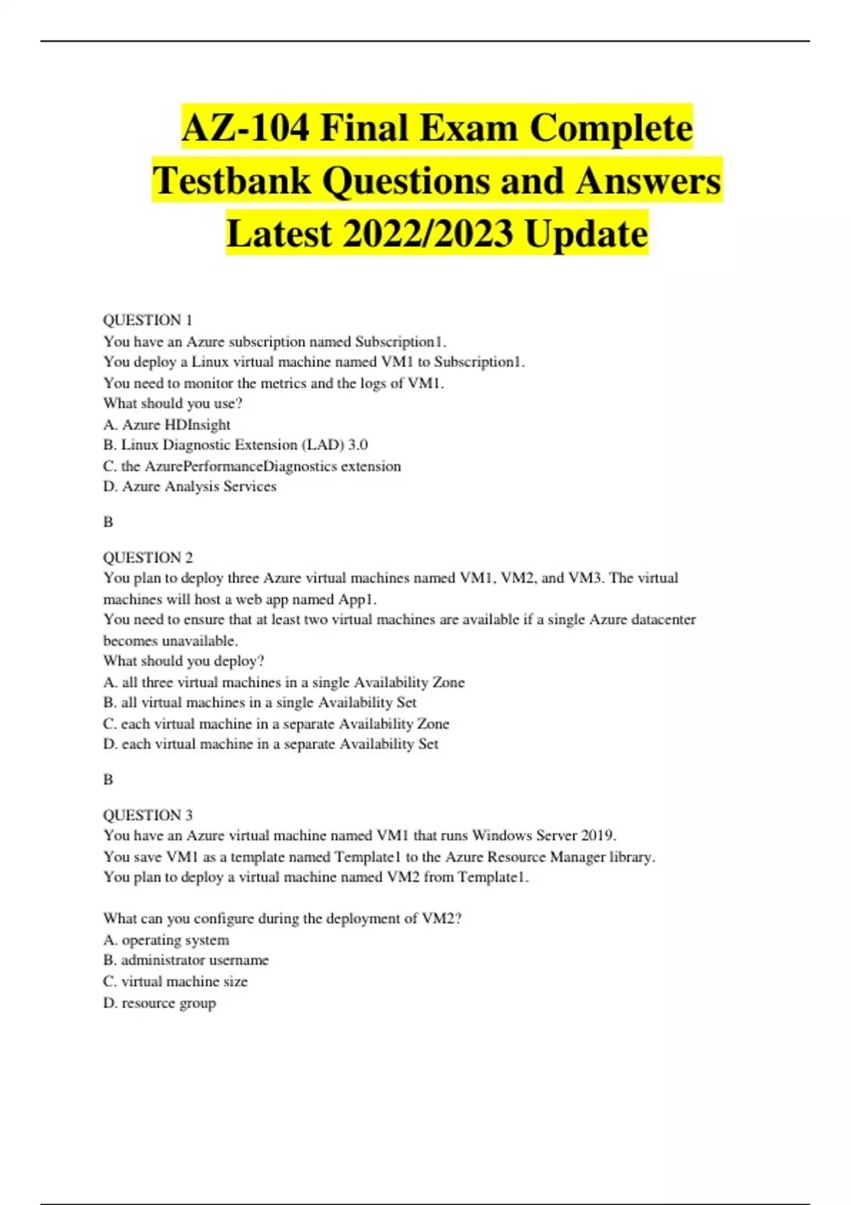 AZ-104 Microsoft Azure Final Exam Testbank Questions and Answers Latest 2022/2023 Update