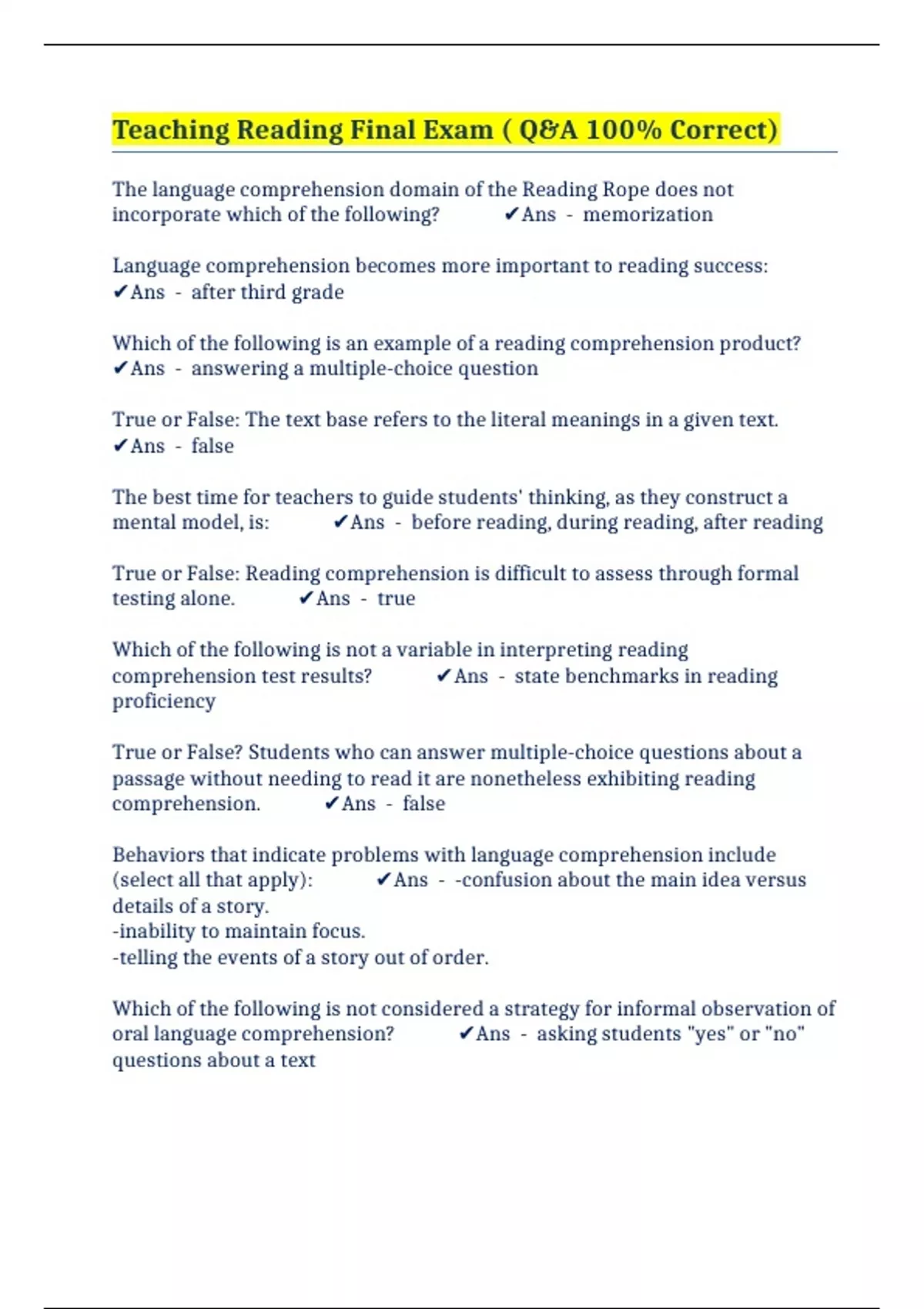 Teaching Reading Final Exam ( Q&A 100% Correct)
