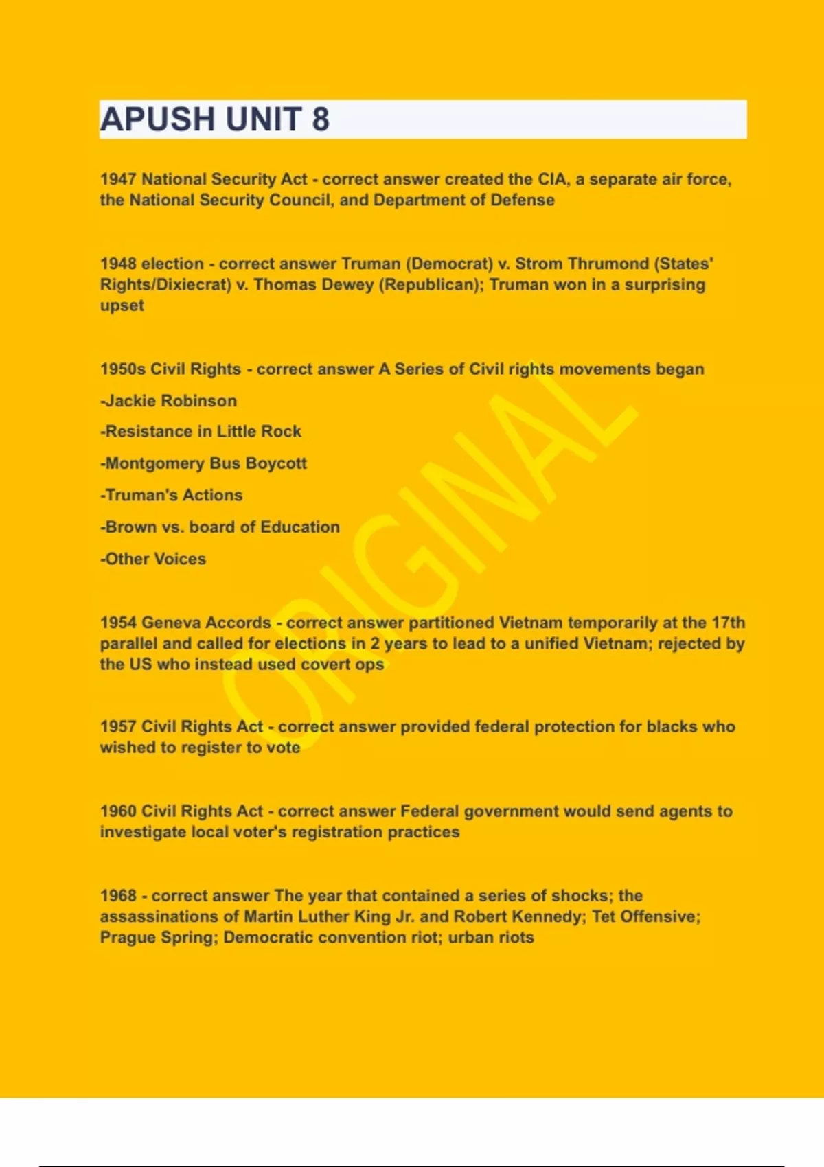 1947 National Security Act created the CIA, a separate air force, the National Security Council, and Department of Defense 1948 election Truman (Democrat) v. Strom Thrumond (States' Rights/Dixiecrat) v. Thomas Dewey (Republican); Truman won in a surprising upset 1950s Civil Rights A Series of Civil rights movements began -Jackie Robinson -Resistance in Little Rock -Montgomery Bus Boycott -Truman's Actions -Brown vs. board of Education -Other Voices 1954 Geneva Accords partitioned Vietnam temporarily at the 17th parallel and called for elections in 2 years to lead to a unified Vietnam; rejected by the US who instead used covert ops 1957 Civil Rights Act provided federal protection for blacks who wished to register to vote 1960 Civil Rights Act Federal government would send agents to investigate local voter's registration practices 1968 The year that contained a series of shocks; the assassinations of Martin Luther King Jr. and Robert Kennedy; Tet Offensive; Prague Spring; Democratic convention riot; urban riots Prague Spring (1968) a failed attempt to reform communism in Czechoslovakia; crushed by Soviet troops 24th Amendment Amendment to the U.S. Constitution (1964) eliminated the poll tax as a prerequisite to vote in national elections. 26th Amendment Lowered the voting age from 21 to 18 38th Parallel Line that divided Korea - Soviet Union occupied the north and United States occupied the south, during the Cold War. Adlai Stevenson The Democratic candidate who ran against Eisenhower in 1952. His intellectual speeches earned him and his supporters the term "eggheads". Lost to Eisenhower. AIM American Indian Movement. demanded greater rights for Native Americans, used violence to make a point Alger Hiss A former State Department official who was accused of being a Communist spy and was convicted of perjury. The case was prosecuted by Richard Nixon. Alliance for Progress President Kennedy's program which gave economic aid to Latin America Assassination of Robert Kennedy (1968) 1968: Democratic presidential who ran for president in 1968 promoting civil rights and other equality based ideals. He was ultimately assassinated in 1968, leaving Nixon to take the presidency but instilling hope in many Americans. Baby Boom the larger than expected generation in United States born shortly after World War II Bay of Pigs An unsuccessful invasion of Cuba in 1961, which was sponsored by the United States. Its purpose was to overthrow Cuban dictator Fidel Castro. Berlin Blockade/Airlift In 1948, Berlin was blocked off by the Soviet Union in order to strangle the Allied forces. To combat this, the United States began to airlift supplies into Berlin. Bien Dien Phu The Battle of Dien Bien Phu was the climactic confrontation of the First Indochina War between the French Union's French Far East Expeditionary Corps and Viet Minh communist-nationalist revolutionaries. Birmingham 1963 demonstrations prompted president Kennedy to call Congress to pass a sweeping civil rights bill. Black Power Movement African American movement that focused on gaining control of economic and political power to achieve equal rights by force in necessary. (Malcolm X) Brinksmanship The principle of not backing down in a crisis, even if it meant taking the country to the brink of war. Policy of both the U.S. and U.S.S.R. during the Cold War. Cambodia Nixon widened the Vietnam War by moving troops into this country to try and remove enemy camps. Camelot Lively atmosphere of the Kennedy administration in the 1960's. Spirit of America suddenly brought to a close at Kennedy's assassination. After JFK died, his wife, Jackie, compared their time in the White House to this musical. civil rights Policies designed to protect people against arbitrary or discriminatory treatment by government officials or individuals. Civil Right Act of 1964 this act banned segregation in all places of public accommodation, prohibited federal money from being used to support segregated programs and created the Equal Employment Opportunity Commission to guard against employment discrimination Clean Air and Clean Water Act Environmental protection laws; showed America's changing attitude toward conservation. (signed by Nixon Dec. 1970) Containment American policy of resisting further expansion of communism around the world CORE Congress of Racial Equality, and organization founded in 1942 that worked for black civil rights Counter Culture Movement People who rejected mainstream American society in the 60s. Based on peace, love, and individual freedom Cuban Missile Crisis The 1962 confrontation bewteen US and the Soviet Union over Soviet missiles in Cuba.
