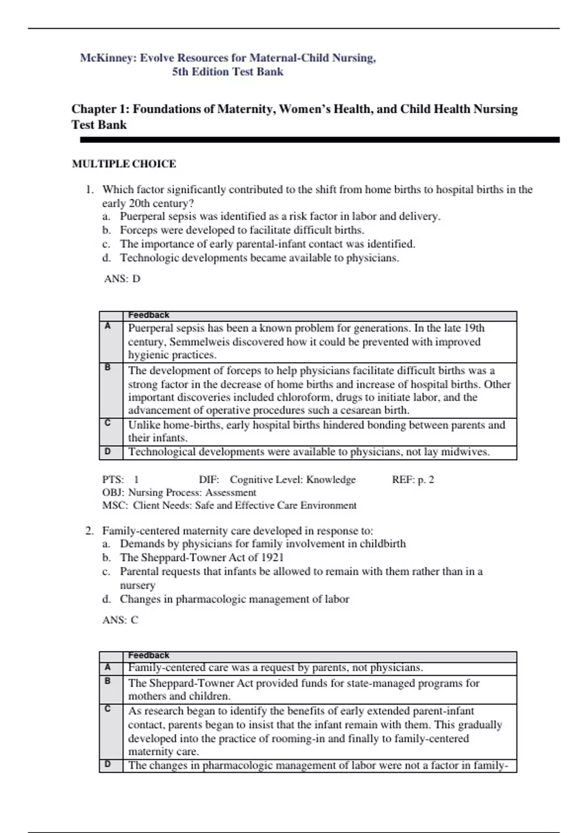 Chapter 1: Foundations of Maternity, Women’s Health, and Child Health Nursing Test Bank MULTIPLE CHOICE 1. Which factor significantly contributed to the shift from home births to hospital births in the early 20th century? a. Puerperal sepsis was identified as a risk factor in labor and delivery. b. Forceps were developed to facilitate difficult births. c. The importance of early parental-infant contact was identified. d. Technologic developments became available to physicians. ANS: D Feedback A Puerperal sepsis has been a known problem for generations. In the late 19th century, Semmelweis discovered how it could be prevented with improved hygienic practices. B The development of forceps to help physicians facilitate difficult births was a strong factor in the decrease of home births and increase of hospital births. Other important discoveries included chloroform, drugs to initiate labor, and the advancement of operative procedures such a cesarean birth. C Unlike home-births, early hospital births hindered bonding between parents and their infants. D Technological developments were available to physicians, not lay midwives. PTS: 1 DIF: Cognitive Level: Knowledge REF: p. 2 OBJ: Nursing Process: Assessment MSC: Client Needs: Safe and Effective Care Environment 2. Family-centered maternity care developed in response to: a. Demands by physicians for family involvement in childbirth b. The Sheppard-Towner Act of 1921 c. Parental requests that infants be allowed to remain with them rather than in a nursery d. Changes in pharmacologic management of labor ANS: C Feedback A Family-centered care was a request by parents, not physicians. B The Sheppard-Towner Act provided funds for state-managed programs for mothers and children. C As research began to identify the benefits of early extended parent-infant contact, parents began to insist that the infant remain with them. This gradually developed into the practice of rooming-in and finally to family-centered maternity care. D The changes in pharmacologic management of labor were not a factor in family- centered maternity care. PTS: 1 DIF: Cognitive Level: Knowledge REF: p. 3 OBJ: Nursing Process: Assessment MSC: Client Needs: Psychosocial Integrity 3. Which setting for childbirth allows the least amount of parent-infant contact? a. Labor/delivery/recovery/postpartum room b. Birth center c. Traditional hospital birth d. Home birth ANS: C Feedback A The labor/delivery/recovery/postpartum room setting allows increased parent- infant contact. B Birth centers are set up to allow an increase in parent-infant contact. C In the traditional hospital setting, the mother may see the infant for only short feeding periods, and the infant is cared for in a separate nursery. D Home births allow an increase in parent-infant contact. PTS: 1 DIF: Cognitive Level: Knowledge REF: p. 3 OBJ: Nursing Process: Planning MSC: Client Needs: Health Promotion and Maintenance 4. As a result of changes in health care delivery and funding, a current trend seen in the pediatric setting is: a. Increased hospitalization of children b. Decreased number of children living in poverty c. An increase in ambulatory care d. Decreased use of managed care ANS: C Feedback A Hospitalization for children has decreased. B Health care delivery has not altered the number of children living in poverty. C One effect of managed care has been that pediatric health care delivery has shifted dramatically from the acute care setting to the ambulatory setting. One of the biggest changes in health care has been the growth of managed care. The number of hospital beds being used has decreased as more care is given in outpatient settings and in the home. The number of children living in poverty has increased over the last decade. D Managed care has increased in order to control cost. PTS: 1 DIF: Cognitive Level: Knowledge REF: p. 6 OBJ: Nursing Process: Planning MSC: Client Needs: Safe and Effective Care Environment 5. The Women, Infants, and Children (WIC) program provides: a. Well-child examinations for infants and children living at the poverty level b. Immunizations for high-risk infants and children c. Screening for infants with developmental disorders d. Supplemental food supplies to low-income women who are pregnant or breastfeeding ANS: D Feedback A Medicaid’s Early and Periodic Screening, Diagnosis, and Treatment Program provides for well-child examinations and for treatment of any medical problems diagnosed during such checkups. B Children in the WIC program are often linked with immunizations, but that is not the primary focus of the program. C Public Law 99-457 provides financial incentives to states to establish comprehensive early intervention services for infants and toddlers with, or at risk for, developmental disabilities. D WIC is a federal program that provides supplemental food supplies to low- income women who are pregnant or breastfeeding and to their children until age 5 years. PTS: 1 DIF: Cognitive Level: Comprehension REF: p. 2 | Tables 1-1, 1-9 OBJ: Nursing Process: Assessment MSC: Client Needs: Physiologic Integrity 6. In most states, adolescents who are not emancipated minors must have the permission of their parents before: a. Treatment for drug abuse b. Treatment for sexually transmitted diseases (STDs) c. Accessing birth control d. Surgery ANS: D Feedback A Most states allow minors to obtain treatment for drug or alcohol abuse without parental consent. B Most states allow minors to obtain treatment for STDs without parental consent. C In most states, minors are allowed access to birth control without parental consent. D If a minor receives surgery without proper informed consent, assault and battery charges against the care provider can result. This does not apply to an emancipated minor (a minor child who has the legal competency of an adult because of circumstances involving marriage, divorce, parenting of a child, living independently without parents, or enlistment in the a