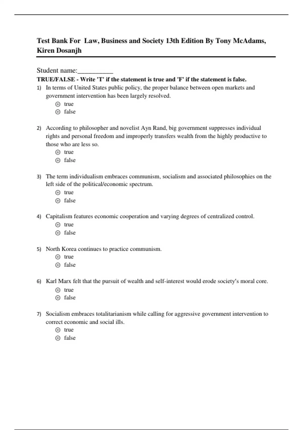 Test Bank for Law, Business and Society 13th Edition By Tony McAdams, Kiren Dosanjh