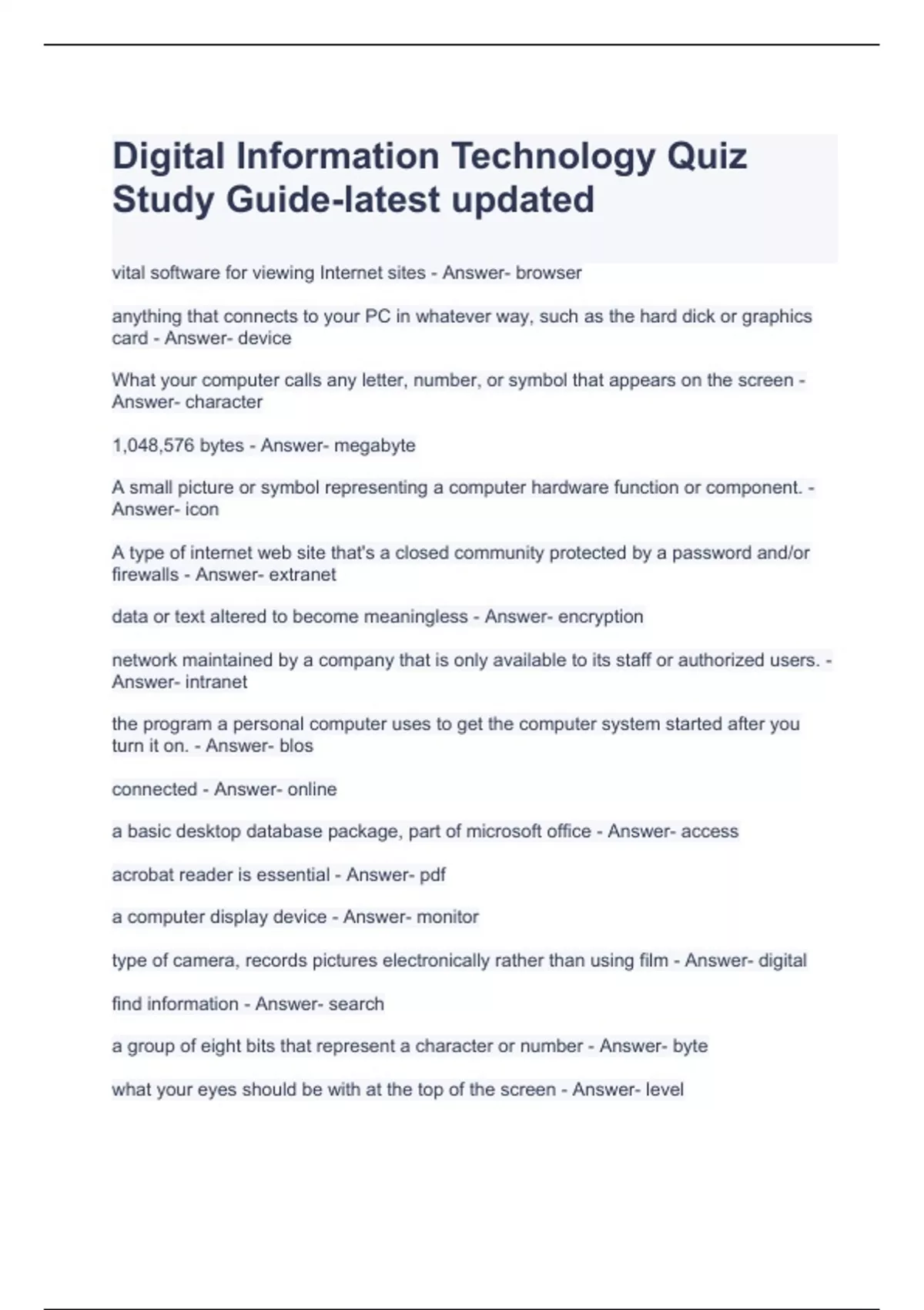 Digital Information Technology Quiz Study Guide-latest updated