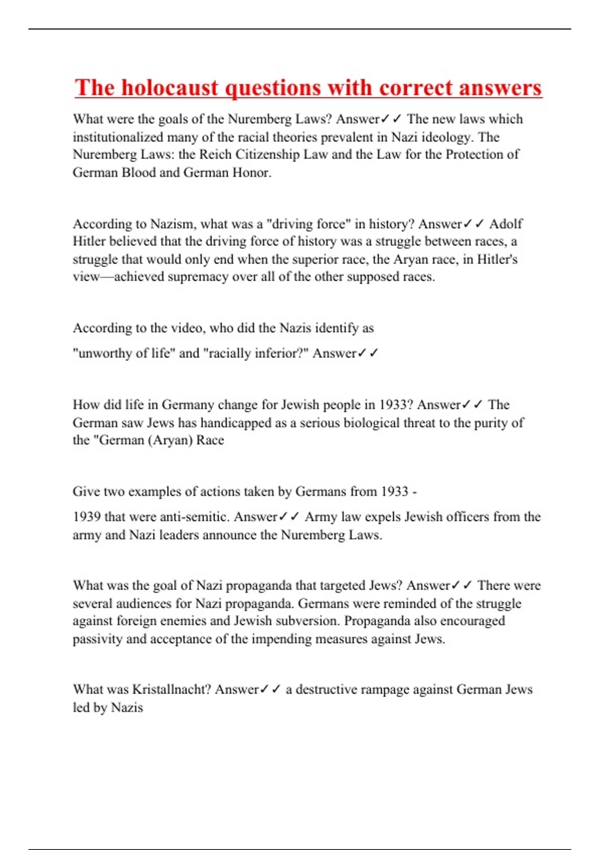 What were the goals of the Nuremberg Laws? Answer The new laws which institutionalized many of the racial theories prevalent in Nazi ideology. The Nuremberg Laws: the Reich Citizenship Law and the Law for the Protection of German Blood and German Honor. According to Nazism, what was a "driving force" in history? Answer Adolf Hitler believed that the driving force of history was a struggle between races, a struggle that would only end when the superior race, the Aryan race, in Hitler's view—achieved supremacy over all of the other supposed races. According to the video, who did the Nazis identify as "unworthy of life" and "racially inferior?" Answer How did life in Germany change for Jewish people in 1933? Answer The German saw Jews has handicapped as a serious biological threat to the purity of the "German (Aryan) Race Give two examples of actions taken by Germans from 1933 - 1939 that were anti-semitic. Answer Army law expels Jewish officers from the army and Nazi leaders announce the Nuremberg Laws. What was the goal of Nazi propaganda that targeted Jews? Answer There were several audiences for Nazi propaganda. Germans were reminded of the struggle against foreign enemies and Jewish subversion. Propaganda also encouraged passivity and acceptance of the impending measures against Jews.
