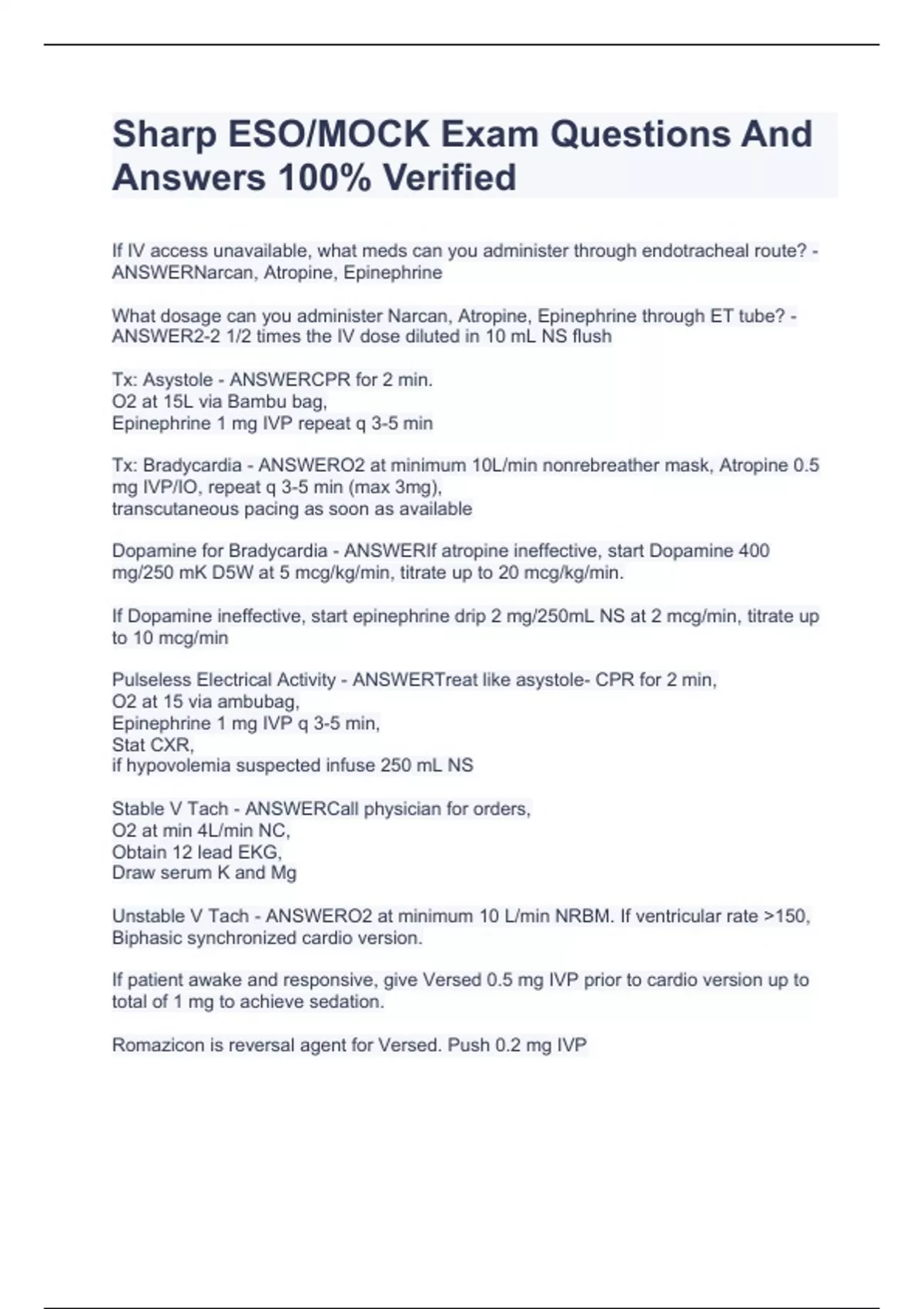 Sharp ESO/MOCK Exam Questions And Answers 100% Verified Sharp ESO/MOCK Exam Questions And Answers 100% Verified Sharp ESO/MOCK Exam Questions And Answers 100% Verified Sharp ESO/MOCK Exam Questions And Answers 100% Verified If IV access unavailable, what meds can you administer through endotracheal route? - ANSWERNarcan, Atropine, Epinephrine What dosage can you administer Narcan, Atropine, Epinephrine through ET tube? - ANSWER2-2 1/2 times the IV dose diluted in 10 mL NS flush Tx: Asystole - ANSWERCPR for 2 min. O2 at 15L via Bambu bag, Epinephrine 1 mg IVP repeat q 3-5 min Tx: Bradycardia - ANSWERO2 at minimum 10L/min nonrebreather mask, Atropine 0.5 mg IVP/IO, repeat q 3-5 min (max 3mg), transcutaneous pacing as soon as available Dopamine for Bradycardia - ANSWERIf atropine ineffective, start Dopamine 400 mg/250 mK D5W at 5 mcg/kg/min, titrate up to 20 mcg/kg/min.