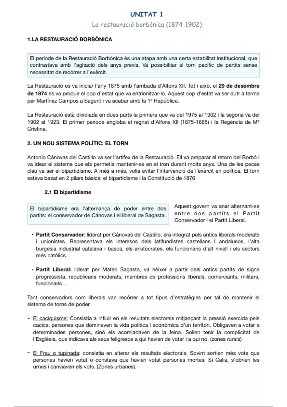 La Restauració està dividiada en dues parts la primera que va del 1975 al 1902 i la segona va del