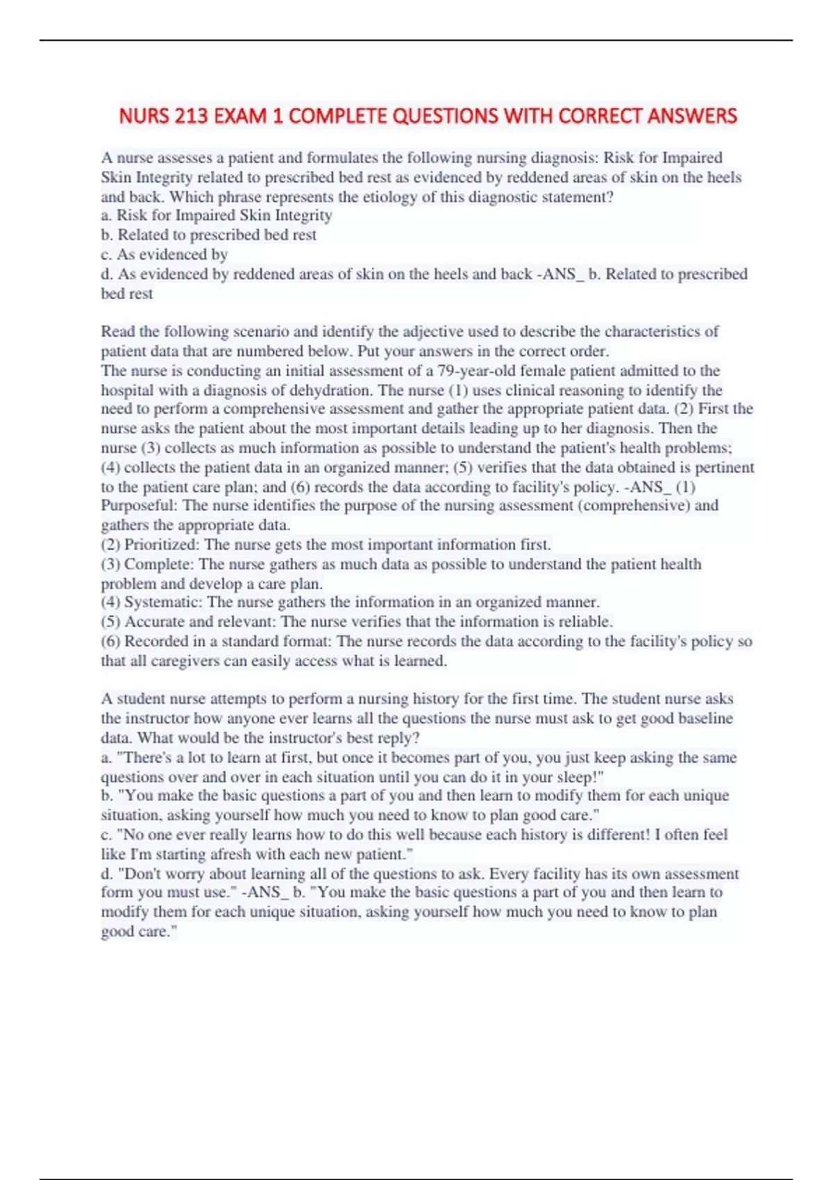 NURS 213 EXAM 1 COMPLETE QUESTIONS WITH CORRECT ANSWERS