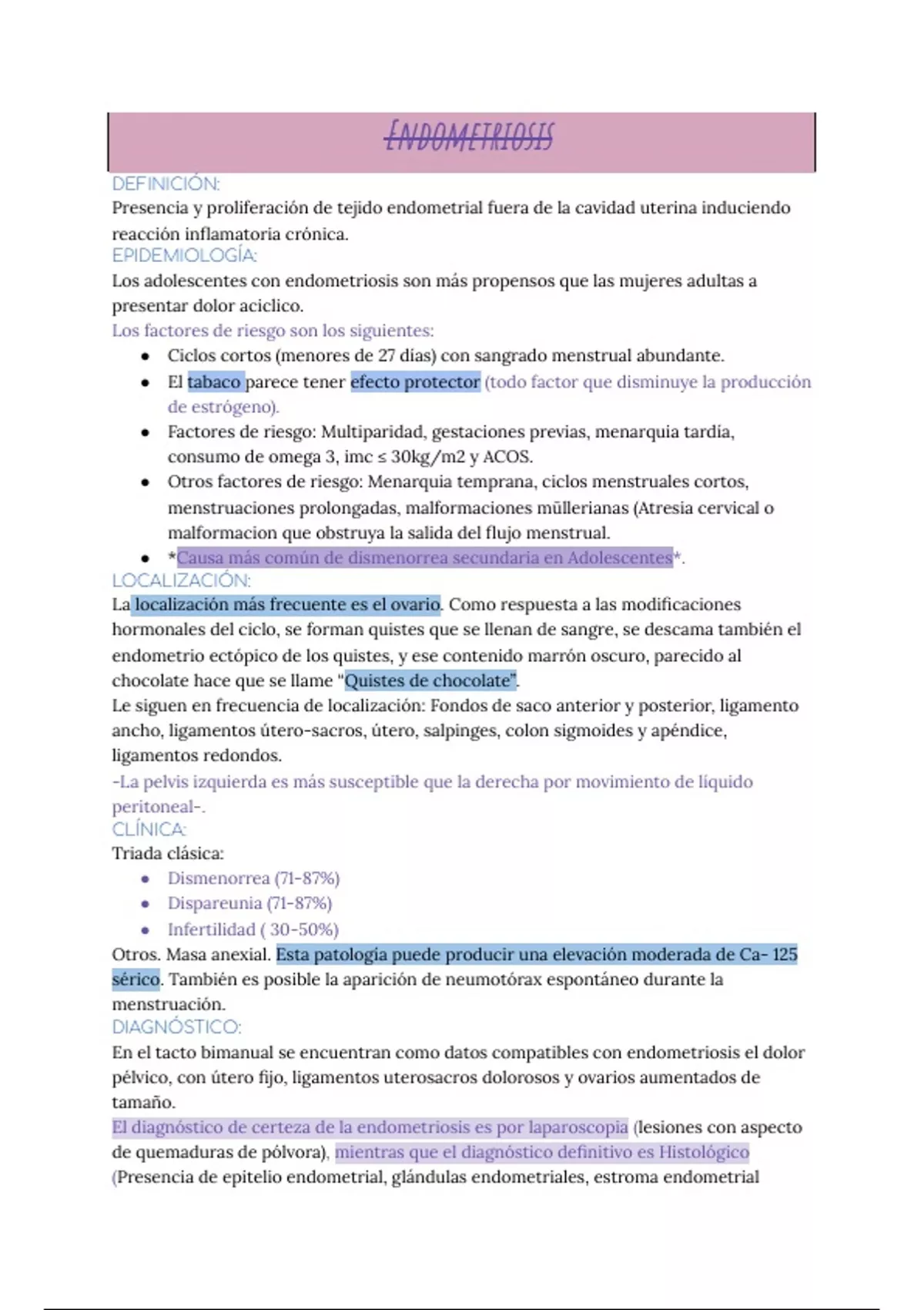Resumen de endometriosis detallado de 3er año, con sus explicaciones sobre cada proceso y medicinal.