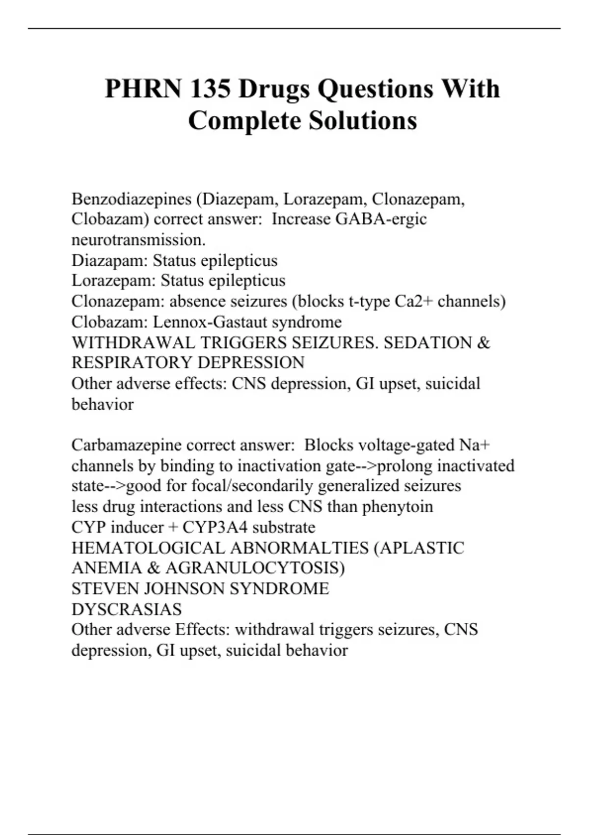 Benzodiazepines (Diazepam, Lorazepam, Clonazepam, Clobazam) correct answer: Increase GABA-ergic neurotransmission. Diazapam: Status epilepticus Lorazepam: Status epilepticus Clonazepam: absence seizures (blocks t-type Ca2+ channels) Clobazam: Lennox-Gastaut syndrome WITHDRAWAL TRIGGERS SEIZURES. SEDATION & RESPIRATORY DEPRESSION Other adverse effects: CNS depression, GI upset, suicidal behavior Carbamazepine correct answer: Blocks voltage-gated Na+ channels by binding to inactivation gate--prolong inactivated state--good for focal/secondarily generalized seizures less drug interactions and less CNS than phenytoin CYP inducer + CYP3A4 substrate HEMATOLOGICAL ABNORMALTIES (APLASTIC ANEMIA & AGRANULOCYTOSIS) STEVEN JOHNSON SYNDROME DYSCRASIAS Other adverse Effects: withdrawal triggers seizures, CNS depression, GI upset, suicidal behavior Divalproex correct answer: 1:1 mix of sodium valproate + valproic acid better GIT tolerance Ethosuximide correct answer: •Blocks t-type Ca+ channels--treats absence seizures for children STEVEN JOHNSON SYNDROME Adverse Effects: withdrawal triggers seizures, CNS depression, GI upset, suicidal behavior, Gabapentin correct answer: Blocks voltage-gated l-type Ca2+ channels--treat generalized seizures except for absence Little drug interaction/mild side effects Less effective compared to other AEDs No hepatic metabolism (excreted unchanged in urine) Adverse Effects: withdrawal triggers seizures, CNS depression, GI upset, suicidal behavior Lacosamide correct answer: Blocks voltage-gated Na+ channels--bind to slow inactivated state--treats focal/secondarily generalized seizures Adverse Effects: withdrawal triggers seizures, CNS depression, GI upset, suicidal behavior Lamotrigine correct answer: Blocks Na+ channels--treats focal/secondarily generalized seizures