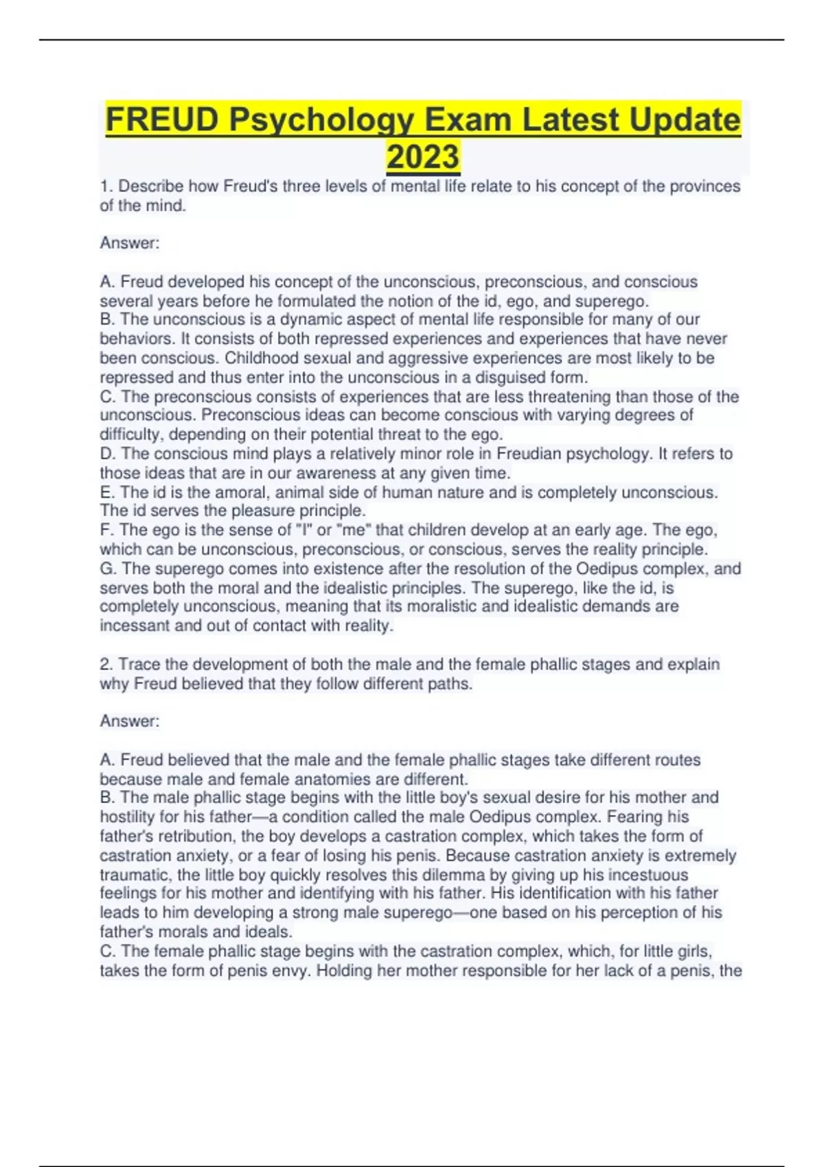FREUD Psychology Exam Latest Update 2023 1. Describe how Freud's three levels of mental life relate to his concept of the provinces of the mind. Answer: A. Freud developed his concept of the unconscious, preconscious, and conscious several years before he formulated the notion of the id, ego, and superego. B. The unconscious is a dynamic aspect of mental life responsible for many of our behaviors. It consists of both repressed experiences and experiences that have never been conscious. Childhood sexual and aggressive experiences are most likely to be repressed and thus enter into the unconscious in a disguised form. C. The preconscious consists of experiences that are less threatening than those of the unconscious. Preconscious ideas can become conscious with varying degrees of difficulty, depending on their potential threat to the ego. D. The conscious mind plays a relatively minor role in Freudian psychology. It refers to those ideas that are in our awareness at any given time. E. The id is the amoral, animal side of human nature and is completely unconscious. The id serves the pleasure principle. F. The ego is the sense of "I" or "me" that children develop at an early age. The ego, which can be unconscious, preconscious, or conscious, serves the reality principle. G. The superego comes into existence after the resolution of the Oedipus complex, and serves both the moral and the idealistic principles. The superego, like the id, is completely unconscious, meaning that its moralistic and idealistic demands are incessant and out of contact with reality. 2. Trace the development of both the male and the female phallic stages and explain why Freud believed that they follow different paths. Answer: A. Freud believed that the male and the female phallic stages take different routes because male and female anatomies are different. B. The male phallic stage begins with the little boy's sexual desire for his mother and hostility for his father—a condition called the male Oedipus complex. Fearing his father's retribution, the boy develops a castration complex, which takes the form of castration anxiety, or a fear of losing his penis. Because castration anxiety is extremely traumatic, the little boy quickly resolves this dilemma by giving up his incestuous feelings for his mother and identifying with his father. His identification with his father leads to him developing a strong male superego—one based on his perception of his father's morals and ideals. C. The female phallic stage begins with the castration complex, which, for little girls, takes the form of penis envy. Holding her mother responsible for her lack of a penis, the girl turns to her father for sexual love and generates hostility for her mother. This condition, called the female Oedipus complex, is more difficult to resolve than the male Oedipus complex because the girl has no traumatic experience (such as castration anxiety) to shatter it. Gradually, the girl sees the futility of her position and turns to her mother for nonsexual love. The girl's identification with her mother leads to the development of the female superego—a superego based on her perception of her mother's morals and ideals. 3. How does Freud's early therapeutic technique relate to recent reports of childhood abuse? Answer: A. Some observers have criticized Freud for abandoning the seduction theory, which placed responsibility for childhood sexual abuse on a parent, usually the father. When Freud substituted the Oedipus complex for the seduction theory, he switched responsibility from the parent to the child. B. Freud's early therapeutic technique was quite active, forceful, and suggestive. He placed his hands on his patients' heads and told them that they would think of something. This procedure usually led to precisely the result that Freud was looking for, namely, the confession of a childhood seduction. C. Freud's highly suggestive technique tended to yield stories of childhood seduction that had been repressed for years. Many current therapists, using somewhat different but equally suggestive procedures, have been able to "recover" patients' long-lost experiences of being sexually or physically abused by an older person, often a parent. - ANSFreud claimed that during the Oedipal period, a boy A. feels sexual love only toward his father. B. feels sexual love only toward his mother. C. may feel sexual love toward each parent. D. is incapable of feeling sexual love toward either parent. - ANS-B or C Which of the following occurs after a successful psychoanalytic treatment? A. Neurotic symptoms are repressed in patients. B. Psychic energy strengthens the superego in patients. C. A patient's positive transference toward the analyst increases. D. A patient's ego is expanded with previously repressed material. E. A patient's ego is incorporated into the superego. - ANS-D Which of the following is the most basic Freudian defense mechanism? A. repression B. reaction formation C. fixation D. projection E. regression - ANS-A Ashley feels uneasy after violating her personal standards of honesty and cheating on a test. Freud might suggest that she is suffering from _____ anxiety. A. aim-inhibited B. realistic C. neurotic D. moral - ANS-D Robin protects herself against the threat of change by constantly clinging to objects and behaviors from her early childhood. It thus appears that Robin is relying primarily on which Freudian defense mechanism? A. reaction formation B. fixation C. projection D. regression E. sublimation - ANS-B Freud's enduring popularity is most likely due to his A. careful experimental analyses. B. gifts as a writer and his emphasis on sex and aggression. C. commonsense model of human development, especially during the infantile stage. D. determination to reverse 19th-century scientific methods. - ANS-B According to Freud, a teenager preoccupied with the self and with personal appearance is exhibiting A. primary narcissism. B. secondary narcissism.