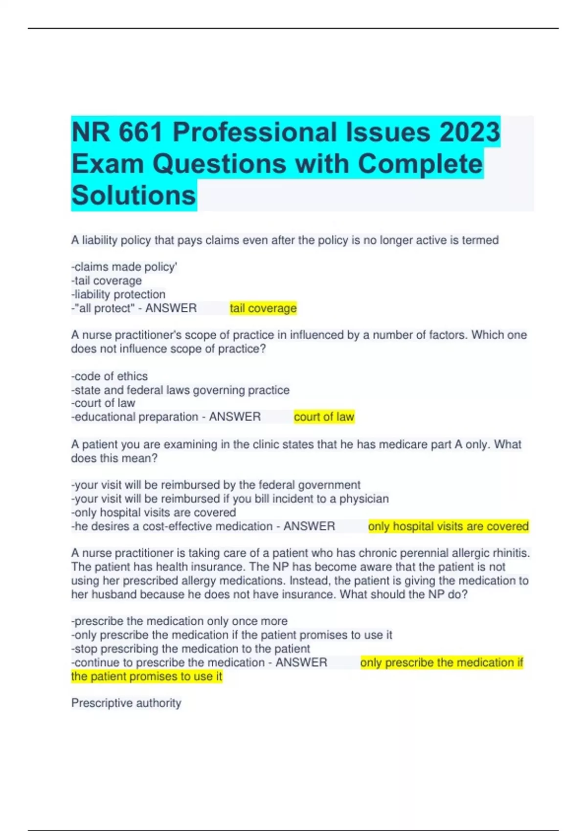 NR 661 Professional Issues 2023 Exam Questions with Complete Solutions A liability policy that pays claims even after the policy is no longer active is termed -claims made policy' -tail coverage -liability protection -"all protect" - ANSWER tail coverage A nurse practitioner's scope of practice in influenced by a number of factors. Which one does not influence scope of practice? -code of ethics -state and federal laws governing practice -court of law -educational preparation - ANSWER court of law A patient you are examining in the clinic states that he has medicare part A only. What does this mean? -your visit will be reimbursed by the federal government -your visit will be reimbursed if you bill incident to a physician -only hospital visits are covered -he desires a cost-effective medication - ANSWER only hospital visits are covered A nurse practitioner is taking care of a patient who has chronic perennial allergic rhinitis. The patient has health insurance. The NP has become aware that the patient is not using her prescribed allergy medications. Instead, the patient is giving the medication to her husband because he does not have insurance. What should the NP do? -prescribe the medication only once more -only prescribe the medication if the patient promises to use it -stop prescribing the medication to the patient -continue to prescribe the medication - ANSWER only prescribe the medication if the patient promises to use it Prescriptive authority -is a right of every practicing nurse practitioner -varies from state to state -is not part of the consensus model -is dependent on certification - ANSWER varies from state to state Standards of practice are established to: -regulate and control nurse practitioner practice -limit liability of nurse practitioners -protect nurse practitioners from frivolous law suits -promote autonomous practice - ANSWER regulate and control nurse practitioner practice