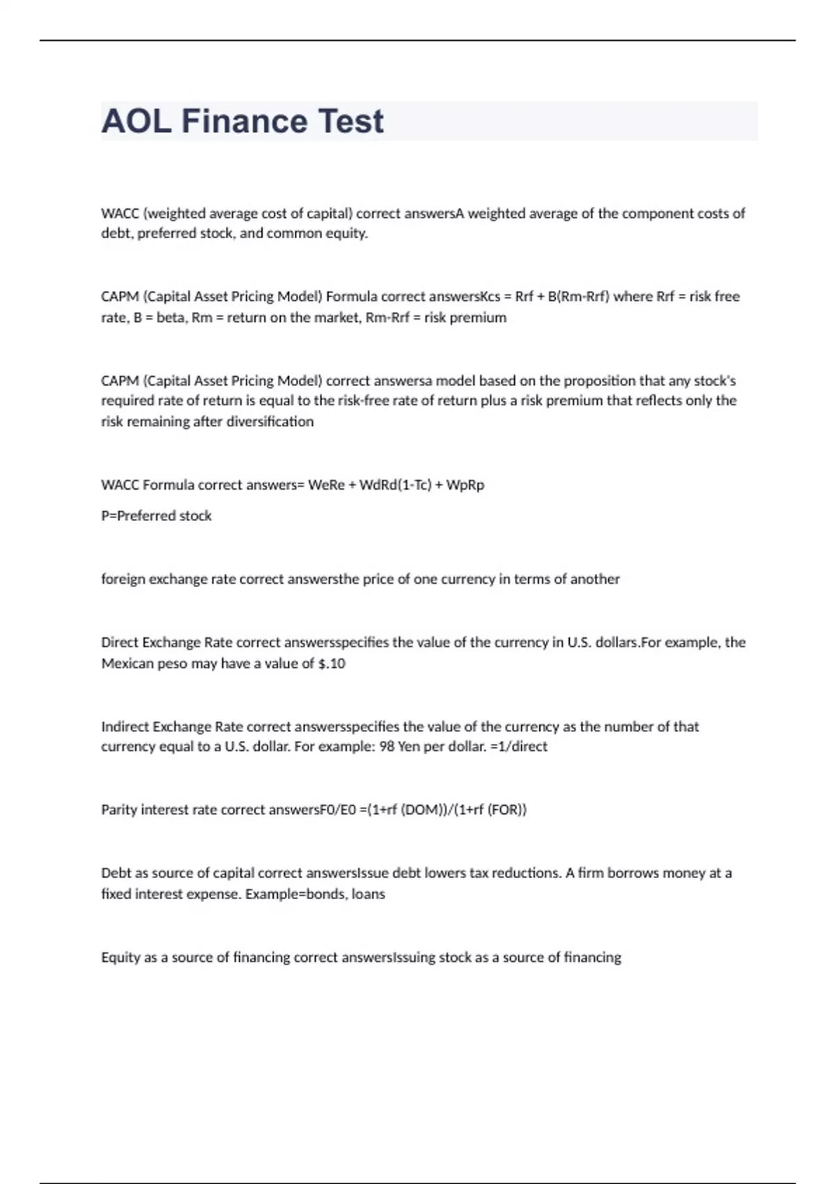 WACC (weighted average cost of capital) correct answersA weighted average of the component costs of debt, preferred stock, and common equity. CAPM (Capital Asset Pricing Model) Formula correct answersKcs = Rrf + B(Rm-Rrf) where Rrf = risk free rate, B = beta, Rm = return on the market, Rm-Rrf = risk premium CAPM (Capital Asset Pricing Model) correct answersa model based on the proposition that any stock's required rate of return is equal to the risk-free rate of return plus a risk premium that reflects only the risk remaining after diversification WACC Formula correct answers= WeRe + WdRd(1-Tc) + WpRp P=Preferred stock foreign exchange rate correct answersthe price of one currency in terms of another Direct Exchange Rate correct answersspecifies the value of the currency in U.S. dollars.For example, the Mexican peso may have a value of $.10 Indirect Exchange Rate correct answersspecifies the value of the currency as the number of that currency equal to a U.S. dollar. For example: 98 Yen per dollar. =1/direct Parity interest rate correct answersF0/E0 =(1+rf (DOM))/(1+rf (FOR)) Debt as source of capital correct answersIssue debt lowers tax reductions. A firm borrows money at a fixed interest expense. Example=bonds, loans Equity as a source of financing correct answersIssuing stock as a source of financing