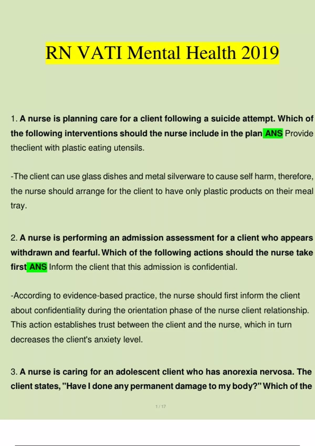 RN VATI Mental Health 2019 Exam Questions and Answers (Verified by Expert)