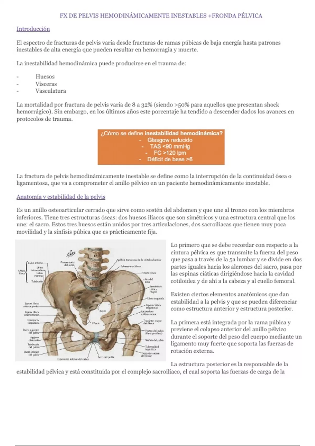 La fractura de pelvis hemodinámicamente inestable se define como la interrupción de la continuidad ósea o