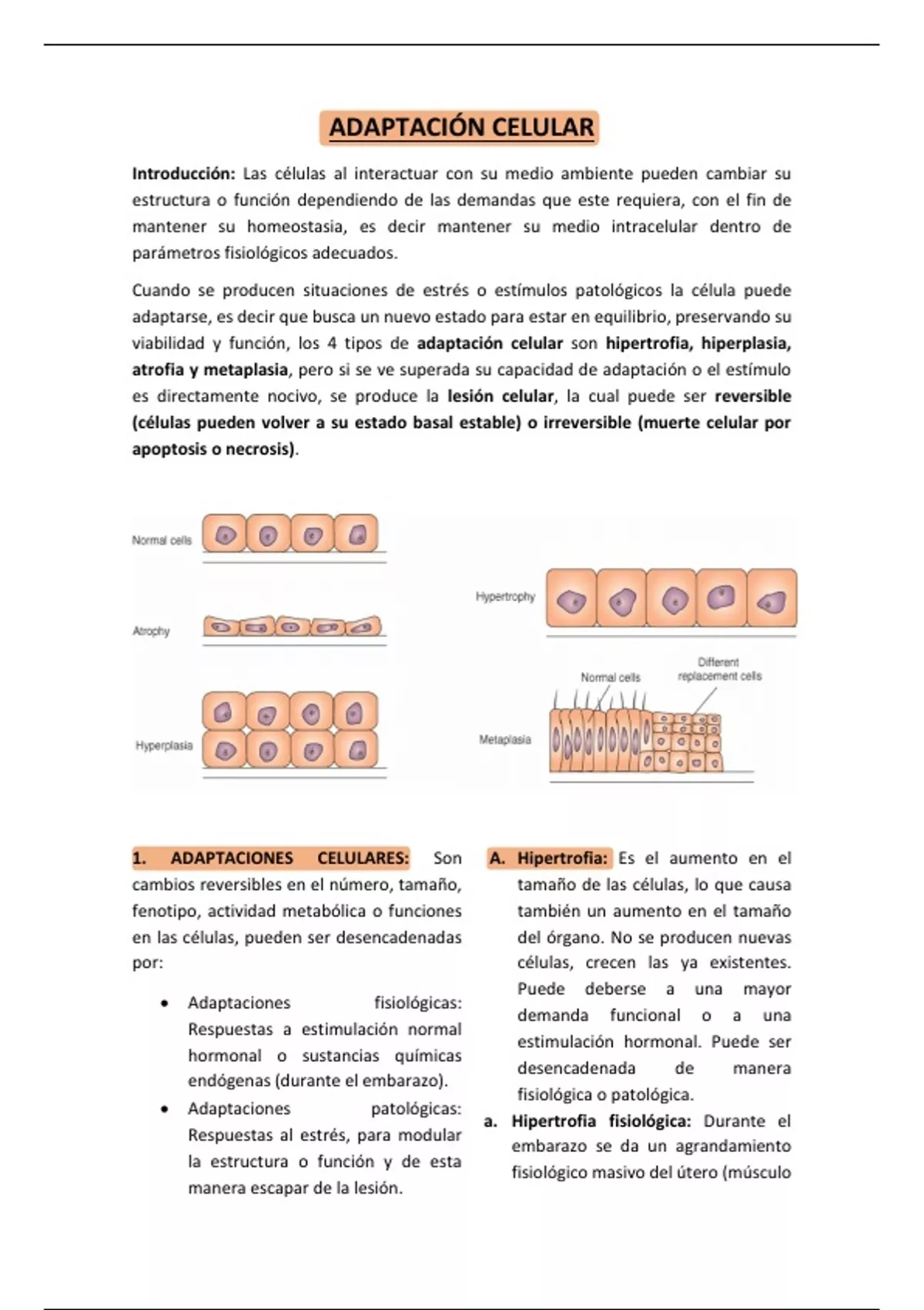 1. ADAPTACIONES CELULARES: Son A. Hipertrofia: Es el aumento en el