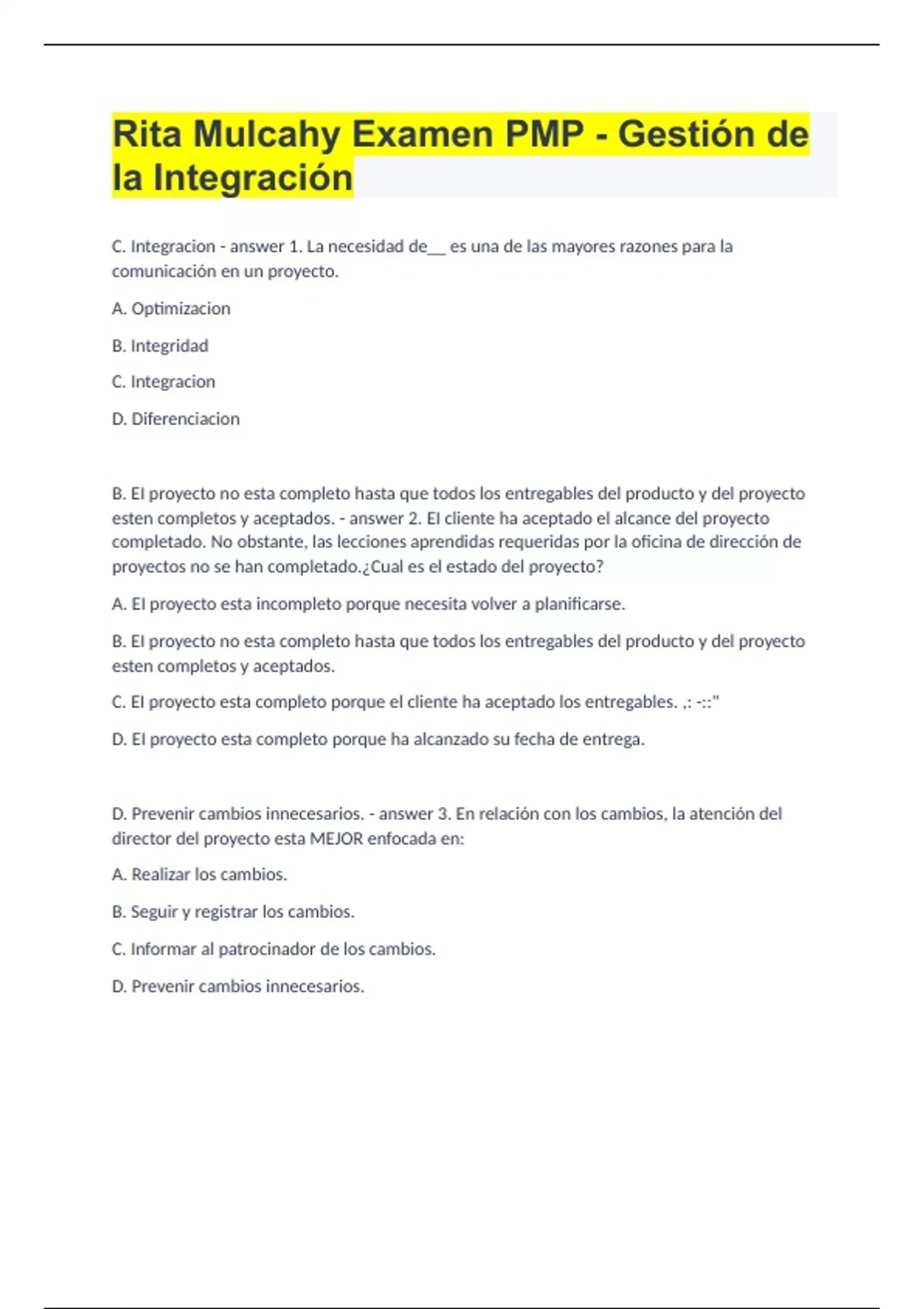 C. Integracion 1. La necesidad de__ es una de las mayores razones para la comunicación en un proyecto. A. Optimizacion B. Integridad C. Integracion D. Diferenciacion B. EI proyecto no esta completo hasta que todos los entregables del producto y del proyecto esten completos y aceptados. 2. EI cliente ha aceptado el alcance del proyecto completado. No obstante, las lecciones aprendidas requeridas por la oficina de dirección de proyectos no se han completado.¿Cual es el estado del proyecto? A. EI proyecto esta incompleto porque necesita volver a planificarse. B. EI proyecto no esta completo hasta que todos los entregables del producto y del proyecto esten completos y aceptados. C. EI proyecto esta completo porque el cliente ha aceptado los entregables. ,: -::" D. EI proyecto esta completo porque ha alcanzado su fecha de entrega. D. Prevenir cambios innecesarios. 3. En relación con los cambios, la atención del director del proyecto esta MEJOR enfocada en: A. Realizar los cambios. B. Seguir y registrar los cambios. C. Informar al patrocinador de los cambios. D. Prevenir cambios innecesarios. B. Cerrar eI Proyecto o Fase. 4. EI cliente de un proyecto le dice al director de proyectos que se quedó sin dinero para pagar eI proyecto. ¿Que debe realizar PRIMERO el director del proyecto? A. Trasladar mas trabajo para que sea realizado mas adelante en el cronograma para que el cliente tenga tiempo de obtener los fondos. B. Cerrar eI Proyecto o Fase. C. Detener el trabajo. D. Liberar parte del equipo del proyecto. D. Lecciones aprendidas. 5. Todos los siguientes son partes de un plan de gestión de cambios efectivo, EXCEPTO: A. Procedimientos. B. Estandares de los informes. C. Reuniones. D. Lecciones aprendidas. B. Gestionar cuando y en que orden se realiza el trabajo 6. Un sistema de autorización de trabajo puede utilizarse para: A. Gestionar quien hace cada actividad. B. Gestionar cuando y en que orden se realiza el trabajo. C. Gestionar cuando se realiza cada actividad. D. Gestionar quien hace cada actividad y cuando se realiza. C. El patrocinador 7. Un proyecto esta plagado de cambios al acta de constitución del proyecto. ¿Quien tiene la responsabilidad principal de decidir si estos cambios son necesarios? A. El director del proyecto B. El equipo del proyecto C. El patrocinador D. Los interesados C. Comunicación efectiva en los puntos clave de la interfase. 8. La integración efectiva del proyecto usualmente requiere un énfasis en: A. Las trayectorias personales de los miembros del equipo. B. Actualizaciones oportunas al plan para la dirección del proyecto. C. Comunicación efectiva en los puntos clave de la interfase. D. Control del producto. A. El director del proyecto. 9. La integración es realizada por: A. El director del proyecto. B. El equipo. C. El patrocinador. D. Los interesados. B. Unir todas las piezas de un proyecto en un todo cohesivo. 10. ¿Cual de las siguientes opciones describe MEJOR el rol del director de proyectos como integrador? A. Ayudar a los miembros del equipo a familiarizarse con el proyecto. B. Unir todas las piezas de un proyecto en un todo cohesivo. C. Unir todas las piezas del proyecto en un programa. D. Unir a todos los miembros del equipo en un todo cohesivo. B. Dirigir y Gestionar el Trabajo del Proyecto 11. ¿Las acciones correctivas aprobadas son una entrada a cuales de los siguientes procesos? A. Validar el Alcance B. Dirigir y Gestionar el Trabajo del Proyecto C. Desarrollar el Acta de Constitucion del Proyecto D. Desarrollar el Cronograma C. Depreciación acelerada. 12. El balance de doble amortización decreciente es una forma de: A. Depreciación desacelerada. B. Depreciación de linea recta. C. Depreciación acelerada. D. Costeo del ciclo de vida. B. Para ayudar a determinar si debe aprobarse un cambio en el alcance 13. ¿Cual de las siguientes opciones describe MEJOR para que se puede utilizar un acta de constitución del proyecto cuando se esta completando el trabajo? A. Para asegurarse de que todos los miembros del equipo sean recompensados B. Para ayudar a determinar si debe aprobarse un cambio en el alcance C. Para evaluar la efectividad del sistema de control de cambios D. Para garantizar que toda la documentación sobre el proyecto este completa C. Planes de gestión de riesgo, recursos humanos, mejora del proceso y otros planes de gestión 14. ¿Cual de las siguientes opciones describe MEJOR un plan para la dirección del proyecto? A. Una impresión de un software de dirección de proyectos B. Un diagrama de barras C. Planes de gestión de riesgo, recursos humanos, mejora del proceso y otros planes de gestión D. El alcance del proyecto D. El director del proyecto crea el acta de constitución del proyecto y el patrocinador la aprueba. 15. ¿Cual de las siguientes opciones es VERDADERA acerca del desarrollo del acta de constitución del proyecto? A. El patrocinador crea el acta de constitución del proyecto y el director del proyecto la aprueba. B. El equipo del proyecto crea el acta de constitución del proyecto y la PMO la aprueba. C. El gerente ejecutivo crea el acta de constitución del proyecto y el gerente funcional la aprueba. D. El director del proyecto crea el acta de constitución del proyecto y el patrocinador la aprueba. D. El director del proyecto crea el plan para la dirección del proyecto basado en las entradas del equipo . 16. Un plan para la dirección del proyecto debe ser realista para poder utilizarse en la dirección de un proyecto. ¿Cual de los siguientes es el MEJOR método para obtener un plan para la dirección del proyecto realista? A. El patrocinador crea el plan para la dirección del proyecto basado en las entradas del director del proyecto. B. El gerente funcional crea el plan para la dirección del proyecto basado en las entradas del director del proyecto. C. El director del proyecto crea el plan para la dirección del proyecto basado en las entradas de la gerencia senior. D. El director del proyecto cr
