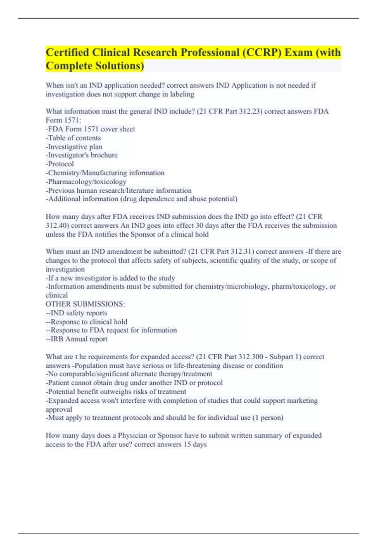 When isn't an IND application needed? correct answers IND Application is not needed if investigation does not support change in labeling What information must the general IND include? (21 CFR Part 312.23) correct answers FDA Form 1571: -FDA Form 1571 cover sheet -Table of contents -Investigative plan -Investigator's brochure -Protocol -Chemistry/Manufacturing information -Pharmacology/toxicology -Previous human research/literature information -Additional information (drug dependence and abuse potential) How many days after FDA receives IND submission does the IND go into effect? (21 CFR 312.40) correct answers An IND goes into effect 30 days after the FDA receives the submission unless the FDA notifies the Sponsor of a clinical hold When must an IND amendment be submitted? (21 CFR Part 312.31) correct answers -If there are changes to the protocol that affects safety of subjects, scientific quality of the study, or scope of investigation -If a new investigator is added to the study -Information amendments must be submitted for chemistry/microbiology, pharm/toxicology, or clinical OTHER SUBMISSIONS: --IND safety reports --Response to clinical hold --Response to FDA request for information --IRB Annual report What are t he requirements for expanded access? (21 CFR Part 312.300 - Subpart 1) correct answers -Population must have serious or life-threatening disease or condition -No comparable/significant alternate therapy/treatment -Patient cannot obtain drug under another IND or protocol -Potential benefit outweighs risks of treatment -Expanded access won't interfere with completion of studies that could support marketing approval -Must apply to treatment protocols and should be for individual use (1 person) How many days does a Physician or Sponsor have to submit written summary of expanded access to the FDA after use? correct answers 15 days