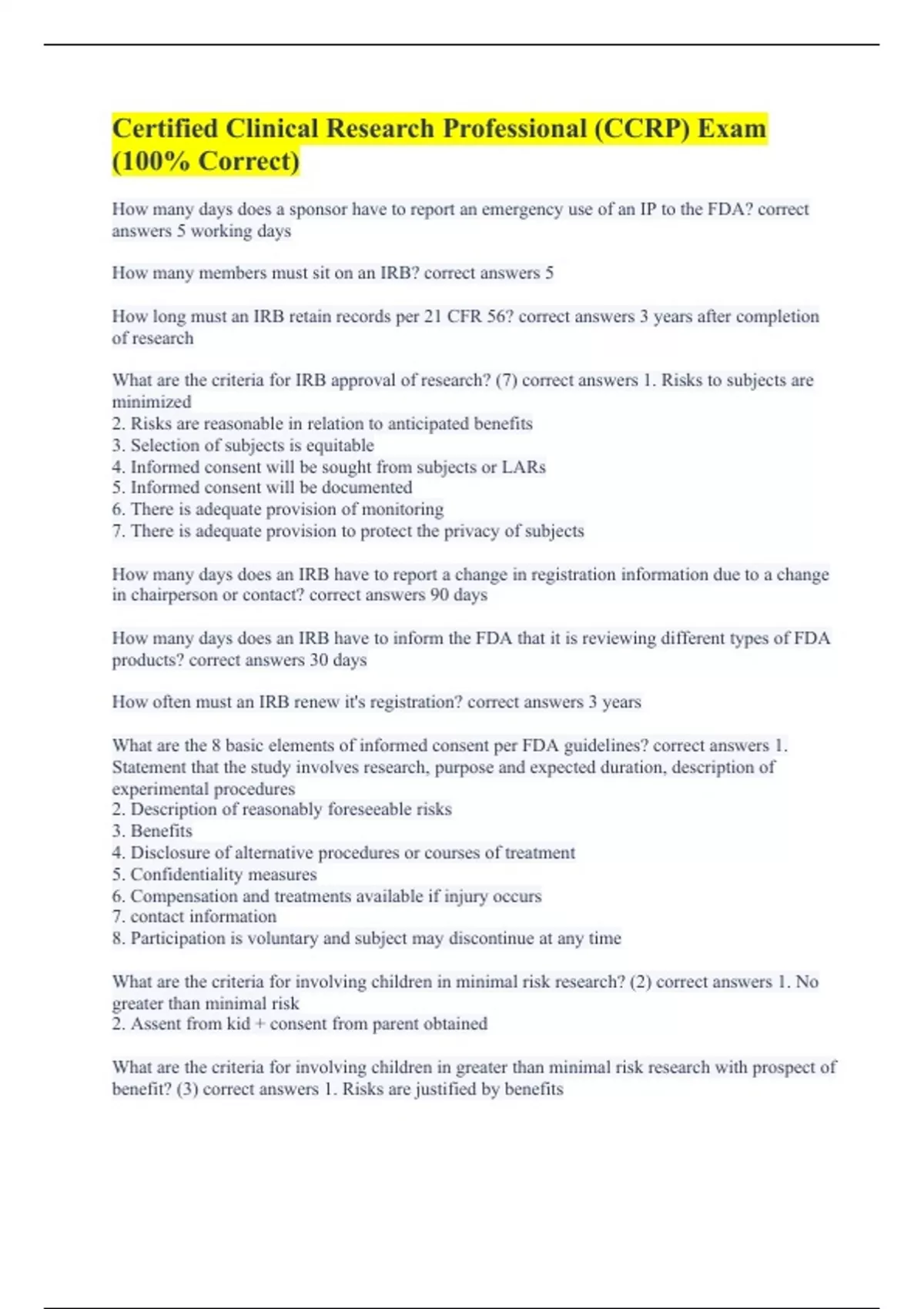 How many days does a sponsor have to report an emergency use of an IP to the FDA? correct answers 5 working days How many members must sit on an IRB? correct answers 5 How long must an IRB retain records per 21 CFR 56? correct answers 3 years after completion of research What are the criteria for IRB approval of research? (7) correct answers 1. Risks to subjects are minimized 2. Risks are reasonable in relation to anticipated benefits 3. Selection of subjects is equitable 4. Informed consent will be sought from subjects or LARs 5. Informed consent will be documented 6. There is adequate provision of monitoring 7. There is adequate provision to protect the privacy of subjects How many days does an IRB have to report a change in registration information due to a change in chairperson or contact? correct answers 90 days How many days does an IRB have to inform the FDA that it is reviewing different types of FDA products? correct answers 30 days How often must an IRB renew it's registration? correct answers 3 years What are the 8 basic elements of informed consent per FDA guidelines? correct answers 1. Statement that the study involves research, purpose and expected duration, description of experimental procedures 2. Description of reasonably foreseeable risks 3. Benefits 4. Disclosure of alternative procedures or courses of treatment 5. Confidentiality measures 6. Compensation and treatments available if injury occurs 7. contact information 8. Participation is voluntary and subject may discontinue at any time What are the criteria for involving children in minimal risk research? (2) correct answers 1. No greater than minimal risk 2. Assent from kid + consent from parent obtained What are the criteria for involving children in greater than minimal risk research with prospect of benefit? (3) correct answers 1. Risks are justified by benefits