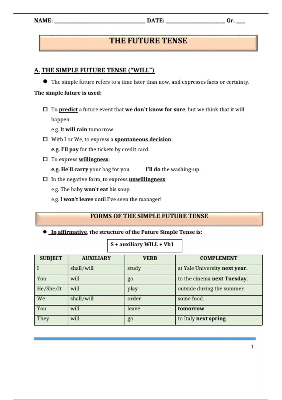 A. THE SIMPLE FUTURE TENSE (“WILL”)