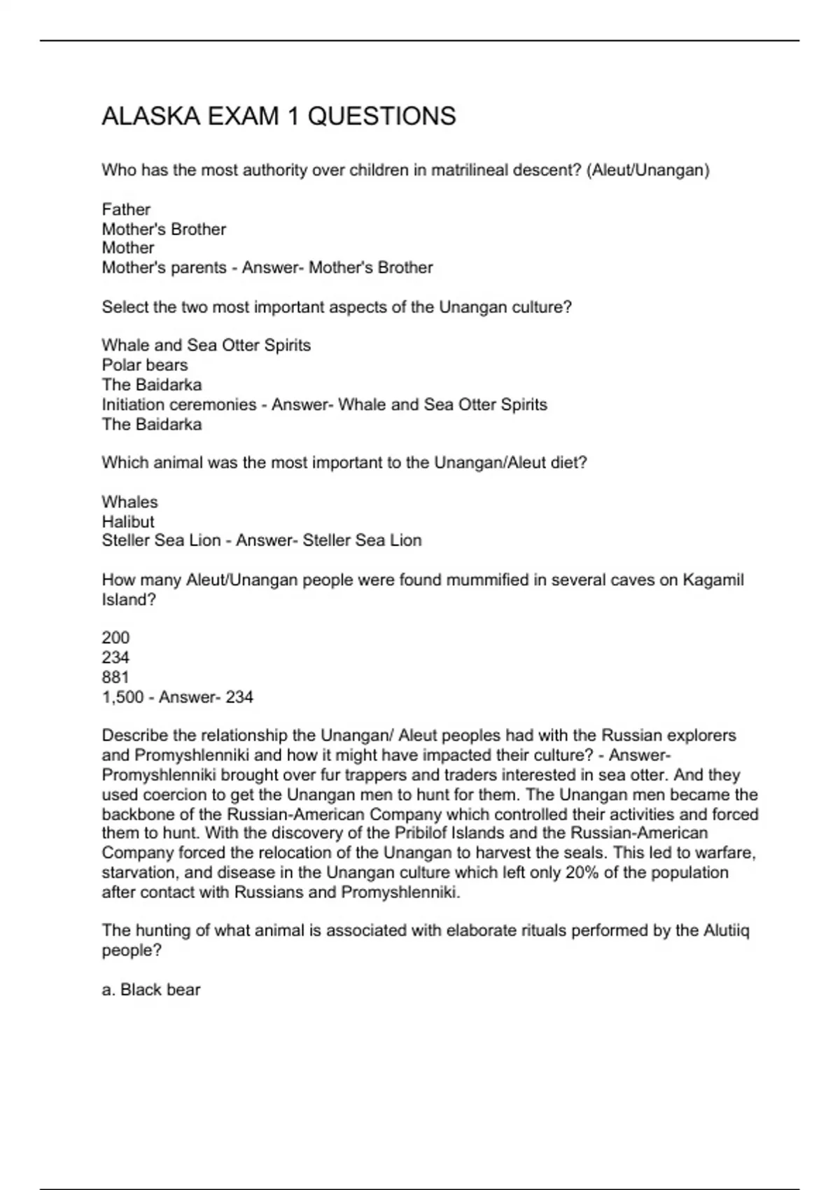 Who has the most authority over children in matrilineal descent? (Aleut/Unangan) Father Mother's Brother Mother Mother's parents - Answer- Mother's Brother Select the two most important aspects of the Unangan culture? Whale and Sea Otter Spirits Polar bears The Baidarka Initiation ceremonies - Answer- Whale and Sea Otter Spirits The Baidarka Which animal was the most important to the Unangan/Aleut diet? Whales Halibut Steller Sea Lion - Answer- Steller Sea Lion How many Aleut/Unangan people were found mummified in several caves on Kagamil Island? 200 234 881 1,500 - Answer- 234 Describe the relationship the Unangan/ Aleut peoples had with the Russian explorers and Promyshlenniki and how it might have impacted their culture? - Answer- Promyshlenniki brought over fur trappers and traders interested in sea otter. And they used coercion to get the Unangan men to hunt for them. The Unangan men became the backbone of the Russian-American Company which controlled their activities and forced them to hunt. With the discovery of the Pribilof Islands and the Russian-American Company forced the relocation of the Unangan to harvest the seals. This led to warfare, starvation, and disease in the Unangan culture which left only 20% of the population after contact with Russians and Promyshlenniki.