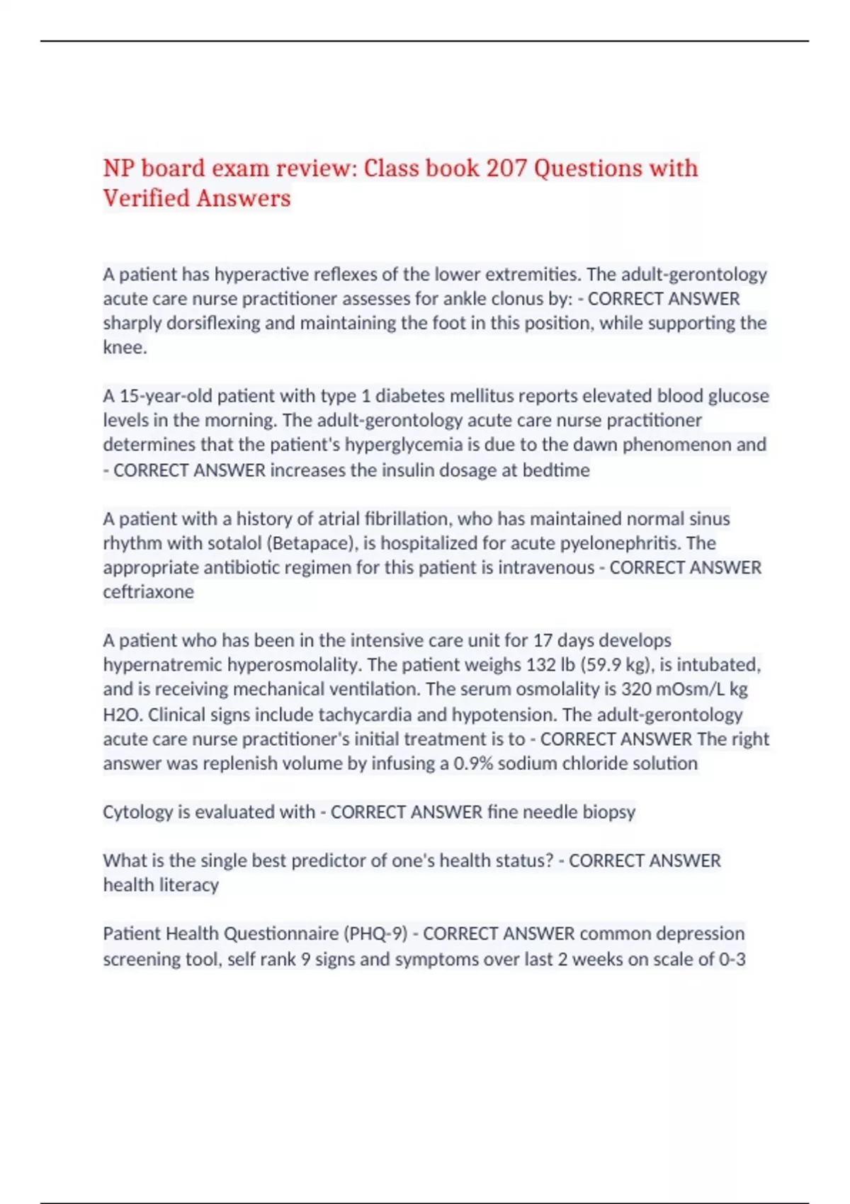 NP board exam review: Class book 207 Questions with Verified Answers A patient has hyperactive reflexes of the lower extremities. The adult-gerontology acute care nurse practitioner assesses for ankle clonus by: - CORRECT ANSWER sharply dorsiflexing and maintaining the foot in this position, while supporting the knee. A 15-year-old patient with type 1 diabetes mellitus reports elevated blood glucose levels in the morning. The adult-gerontology acute care nurse practitioner determines that the patient's hyperglycemia is due to the dawn phenomenon and - CORRECT ANSWER increases the insulin dosage at bedtime A patient with a history of atrial fibrillation, who has maintained normal sinus rhythm with sotalol (Betapace), is hospitalized for acute pyelonephritis. The appropriate antibiotic regimen for this patient is intravenous - CORRECT ANSWER ceftriaxone A patient who has been in the intensive care unit for 17 days develops hypernatremic hyperosmolality. The patient weighs 132 lb (59.9 kg), is intubated, and is receiving mechanical ventilation. The serum osmolality is 320 mOsm/L kg H2O. Clinical signs include tachycardia and hypotension. The adult-gerontology acute care nurse practitioner's initial treatment is to - CORRECT ANSWER The right answer was replenish volume by infusing a 0.9% sodium chloride solution Cytology is evaluated with - CORRECT ANSWER fine needle biopsy What is the single best predictor of one's health status? - CORRECT ANSWER health literacy Patient Health Questionnaire (PHQ-9) - CORRECT ANSWER common depression screening tool, self rank 9 signs and symptoms over last 2 weeks on scale of 0-3 CAGE-AID - CORRECT ANSWER C-have you ever felt that you ought to cut down on your drinking or drug use? A-have people annoyed you by criticizing your drinking or drug use? G-have you ever felt bad or guilty about your dirnking or drug use? E-Have you ever had a drink or used drugs first thing in the morning to steady your nerves or to get rid of a hangover? (e.g. eye opener) Ramsay Sedation scale - CORRECT ANSWER Awake: 1: anxious, agitated, restless 2: cooperative, oriented, tranquil 3: responsive to commands only Sleeping: 4:response to light glabellar tap ro loud auditory stimulus 5: sluggish response to light glabellar tap or loud auditory stimulus 6: no response to light glabellar tap or loud auditory stimulus Brief pain inventory - CORRECT ANSWER Assess impact of pain on daily life What is a good assessment tool for chronic pain such as with cancer patients? - CORRECT ANSWER Brief pain inventory Go review MMSE - CORRECT ANSWER What physical activity is good for Parkinson's patients? - CORRECT ANSWER Tai chi What is salsa dancing good for? - CORRECT ANSWER Coordination What is benchmarking? - CORRECT ANSWER Comparison and measurement of a healthcare organization's services against other national healthcare organizations HIPAA title I - CORRECT ANSWER protects health insurance coverage for workers and their families when they change or lose their jobs i.e. cobra HIPAA title II - CORRECT ANSWER administrative simplification provisions, standards for electronic healthcare transactions and national identifiers for providers, health insurance, and employers Who enforces HIPAA? - CORRECT ANSWER Office of civil rights Levels of facial fracture - CORRECT ANSWER 1. floating pallet 2. mandible 3. Face What is a tertiary facility - CORRECT ANSWER Provides specialized care i.e. level 1 trauma 2 goals of healthy people 2020 - CORRECT ANSWER increase quality and years of healthy life and eliminate health disparities among Americans Infections that require reporting to health department (5) - CORRECT ANSWER gonorrhea, chlamydia, syphilis, HIV, TB Who sets standards of coding (E&M) ? - CORRECT ANSWER medicare What are examples of 3rd party payers? - CORRECT ANSWER Medicare, Medicaid, commercial insurers, HMOs, schools providing insurance Medicare A - CORRECT ANSWER covers hospitalizations, SNFs, home health, hospice if associated with hospitalizations Medicare B - CORRECT ANSWER Covers provider services, outpatient, labs and diagnostics, supplemental requiring premium, medicare pays 80% of bill Medicare C - CORRECT ANSWER A+B = C; medicare advantage, receive services under one provider e.g. HMO, PPO Medicare D - CORRECT ANSWER limited prescription coverage, monthly premium, includes copay, need to enroll when first eligible What is required for a NP to be able to bill medicare? - CORRECT ANSWER Hold a state license, be certified by a professional body, hold at least a MSN degree What is an important goal of CQI/QA? - CORRECT ANSWER monitoring outcomes of care Who dictates the level of prescriptive authority? - CORRECT ANSWER state practice acts Who allows NPs to admit to the hospital? - CORRECT ANSWER joint comission Nonmaleficence - CORRECT ANSWER duty to do no harm utilitarianism - CORRECT ANSWER the right act is the one that produces the greatest good for the greatest number BEneficence - CORRECT ANSWER the duty to prevent harm and promote good justice - CORRECT ANSWER the duty to be fair fidelity - CORRECT ANSWER the duty to be faithful veracity - CORRECT ANSWER the duty to be truthful autonomy - CORRECT ANSWER the duty to respect the individual's thoughts and actions What two ethical principles are often in conflict? - CORRECT ANSWER Beneficence and autonomy What is a quazi experiment? - CORRECT ANSWER An experiment that lacks either a comparison group or randomization Sensitivity vs specificity - CORRECT ANSWER Sensitivity is positive and specificity is negative What lab value contraindicates use of sux? - CORRECT ANSWER Hyperkalemia What common liver met site can cause a fever? - CORRECT ANSWER Liver What is a left shift? - CORRECT ANSWER Bandemia What is the most common type of headache - CORRECT ANSWER Tension What blood test tests for syphillus? - CORRECT ANSWER VDRL What qualifies a migraine sufferer to have prophylactic therapy? - CORRECT ANSWER Attacks more than 2-3 times per mont