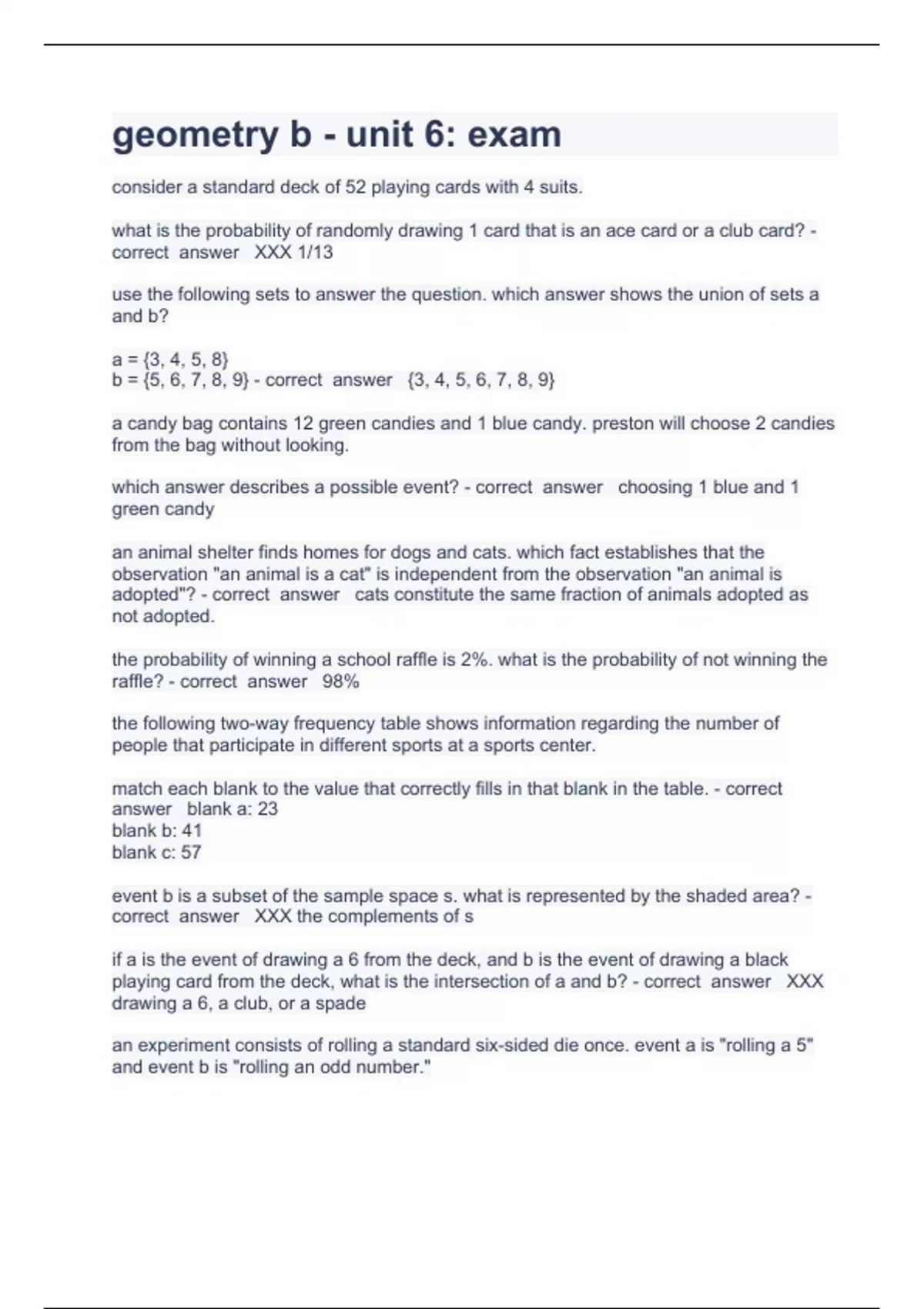 geometry b Questions with consider a standard deck of 52 playing cards with 4 suits. what is the probability of randomly drawing 1 card that is an ace card or a club card? - correct answer XXX 1/13 use the following sets to answer the question. which answer shows the union of sets a and b? a = {3, 4, 5, 8} b = {5, 6, 7, 8, 9} - correct answer {3, 4, 5, 6, 7, 8, 9} a candy bag contains 12 green candies and 1 blue candy. preston will choose 2 candies from the bag without looking. which answer describes a possible event? - correct answer choosing 1 blue and 1 green candy complete solution 2023/2024
