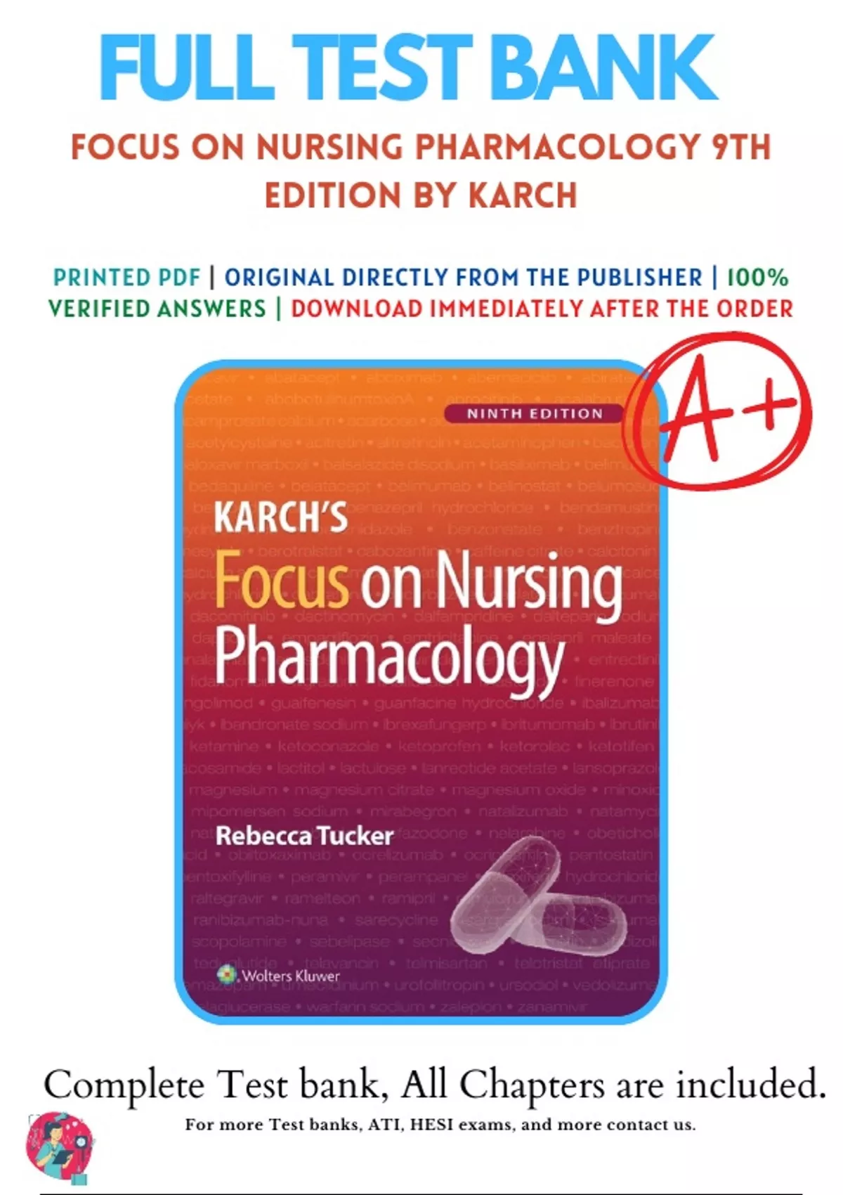 Title: Test Bank For Focus On Nursing Pharmacology 9th Edition By Karch ISBN: 9781975180409 Number of Pages: 979 Edition: 9th Author: Karch Number of Chapters: 60 Enhance your nursing studies with the Test Bank for Focus On Nursing Pharmacology 9th Edition By Karch. With an ISBN of 9781975180409, this test bank is an essential resource for all nursing students. Why should nursing students choose our test bank? _Instant Download: Say goodbye to waiting! Get instant access to your test bank as soon as you purchase it. _Complete Coverage: All chapters are included, ensuring you won't miss out on any crucial information. _Comprehensive Questions: Our test banks not only contain questions but also provide detailed, rational answers. This ensures a deep and thorough understanding of each topic, making your study sessions highly effective. _Authenticity Guaranteed: Our test banks are sourced directly from the publisher, so you can trust their authenticity and accuracy. Invest in your future and give yourself the best preparation tool. Order the Test Bank for Focus On Nursing Pharmacology 9th Edition By Karch now and take your nursing knowledge to new heights!