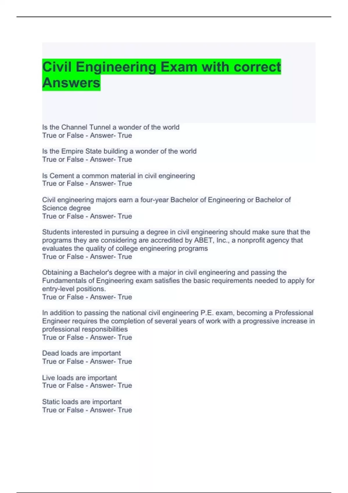 Civil Engineering Exam with correct Answers